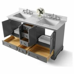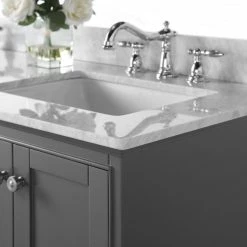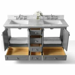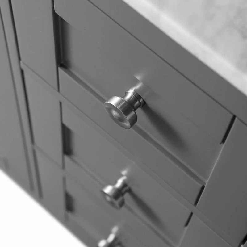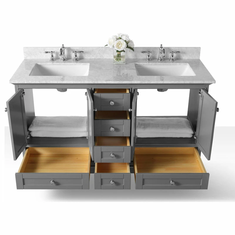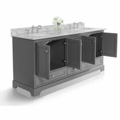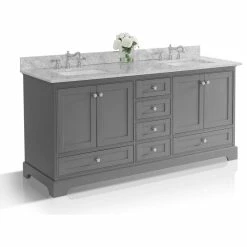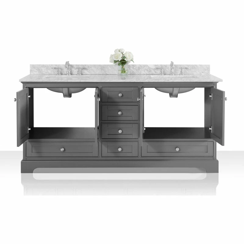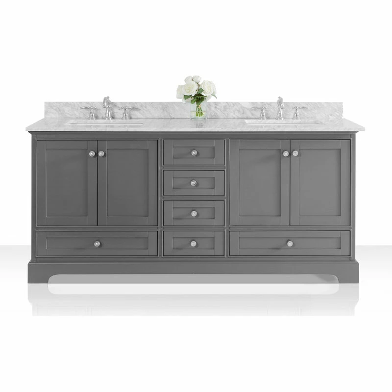 Reflecting beauty and elegance. The Audrey collection is an articulated French classic design that is skillfully handcrafted to perfection. From selecting quality wood and using the most durable soft-close hardware, no details were overlooked in crafting the Audrey 72 in. Vanity set. The vanity set includes a furniture style cabinet, imported Italian Carrara white marble top with a 4 in. Backsplash, wide rectangular under mount basin, solid wood dovetailed drawer boxes, soft-close doors & drawers and brushed nickel hardware. Complete the look with our LED and framed mirrors which are sold separately.