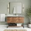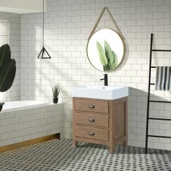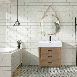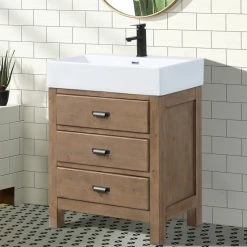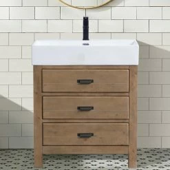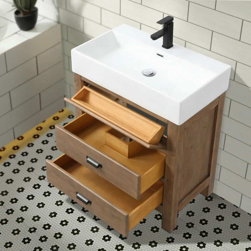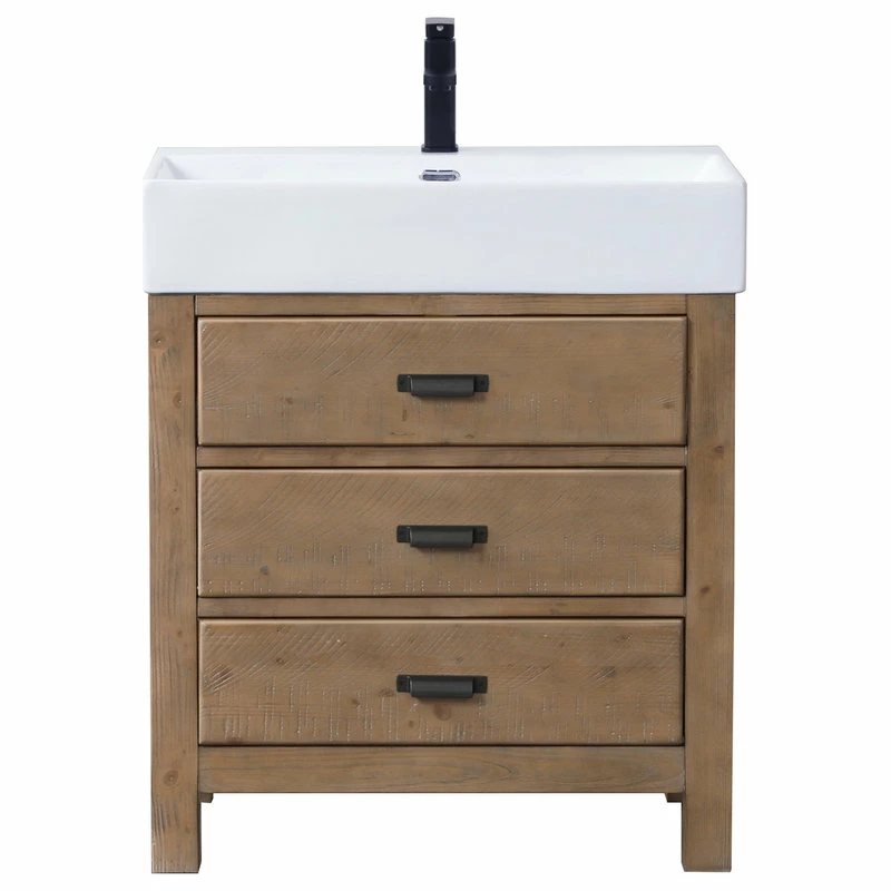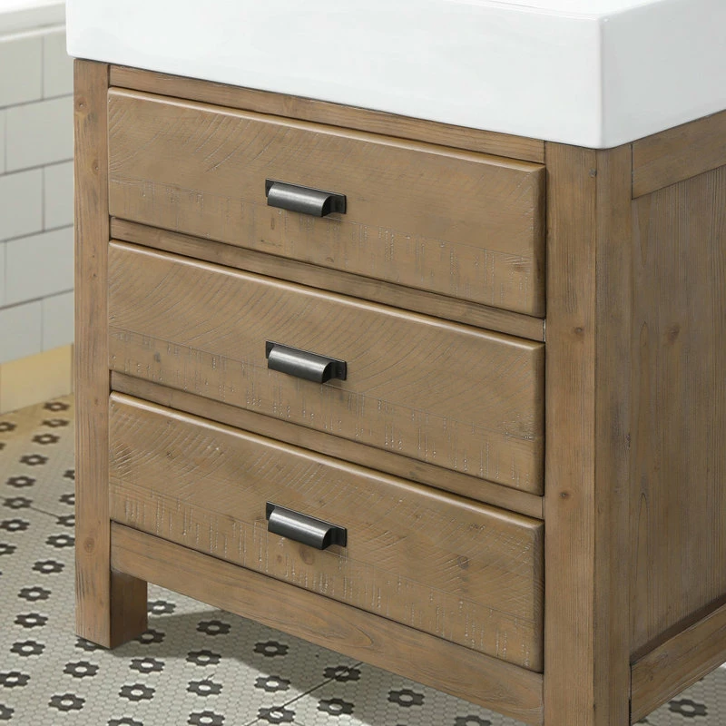 The 30″ Ava single sink bathroom vanity will be the centerpiece of your bathroom remodel. Skillfully constructed of solid wood to last a lifetime. Wood is skillfully finished with raised grain to give a distressed and reclaim wood look. Three solid wood dovetail drawers with full extension glides give you all the necessary storage room for your daily toiletries, coupled with an integrated ceramic sink.