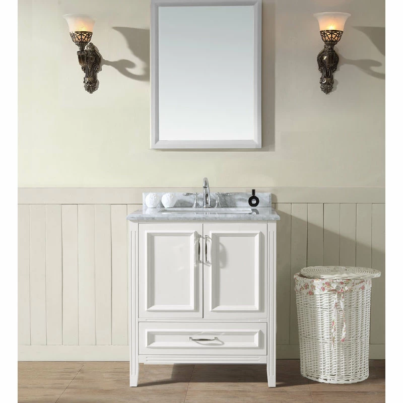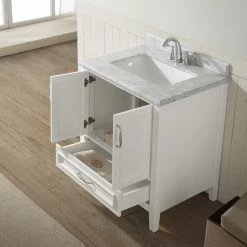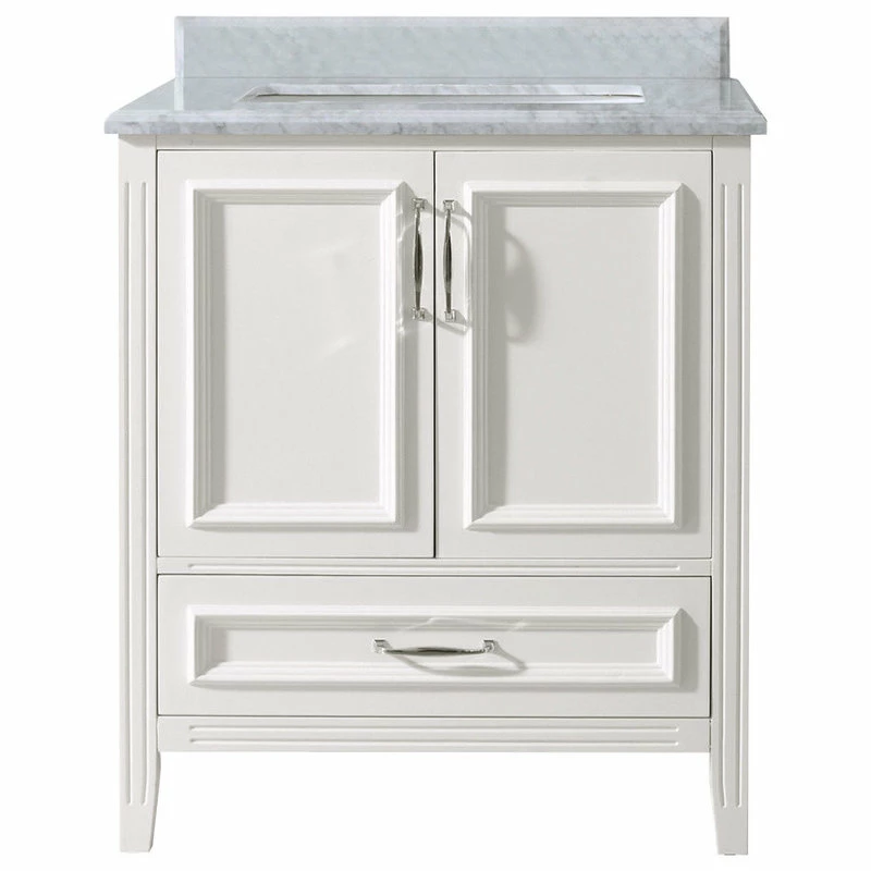 For a guest bathroom awash in style, install the Jude single vanity. It’s the perfect blend of form and function with an attractive white finish, brushed chrome hardware and a Carrara marble top, as well as plenty of drawer and cabinet space to organize all your bathroom essentials.