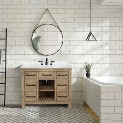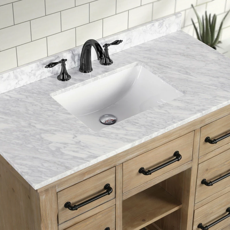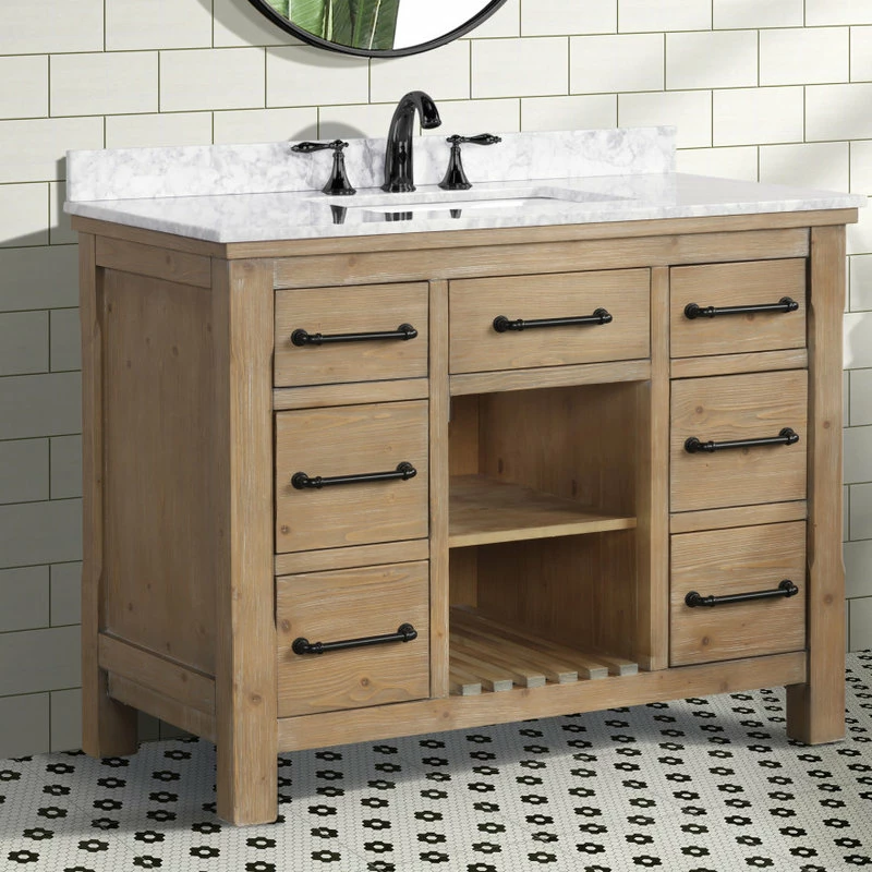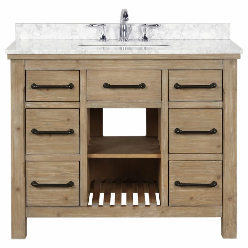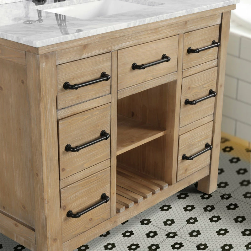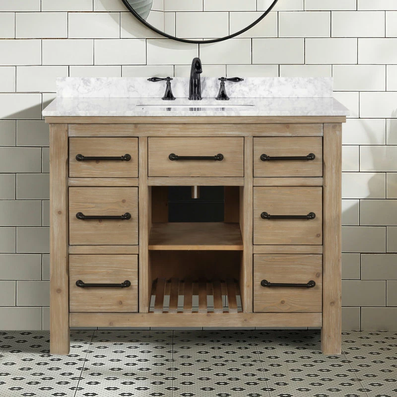 The 42″ Lauren single sink bathroom vanity will be the centerpiece of your bathroom remodel. Skillfully constructed of solid wood to last a lifetime. Wood is skillfully finished with raised grain to give a distress and reclaim wood look. Six solid wood dovetail drawers with full extension glides give you all the necessary storage room for your daily toiletries, coupled with authentic Italian carrara marble countertop to finish off your farmhouse remodel.