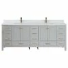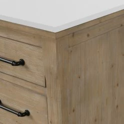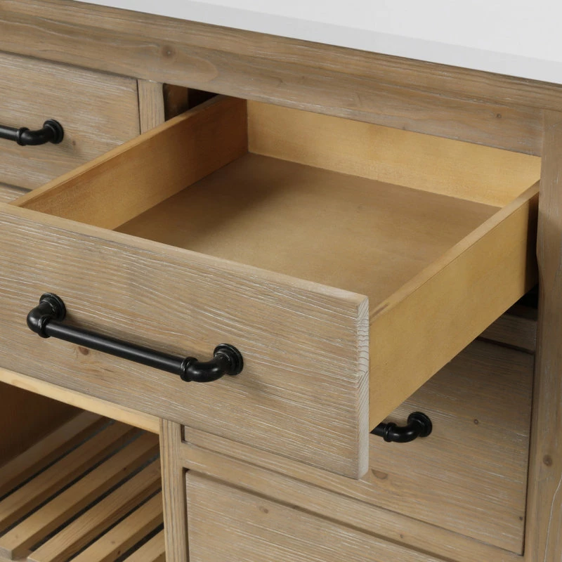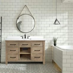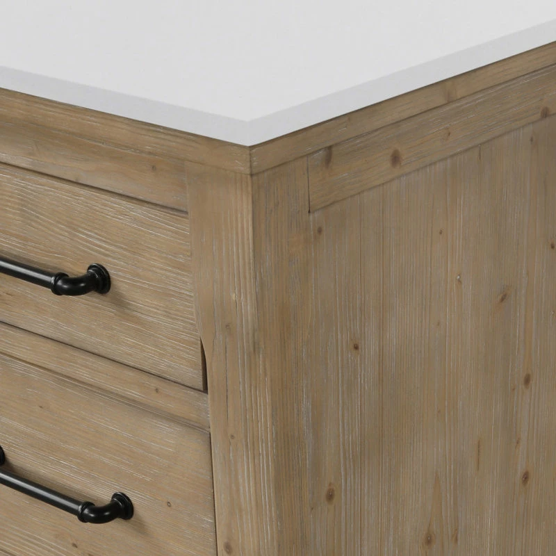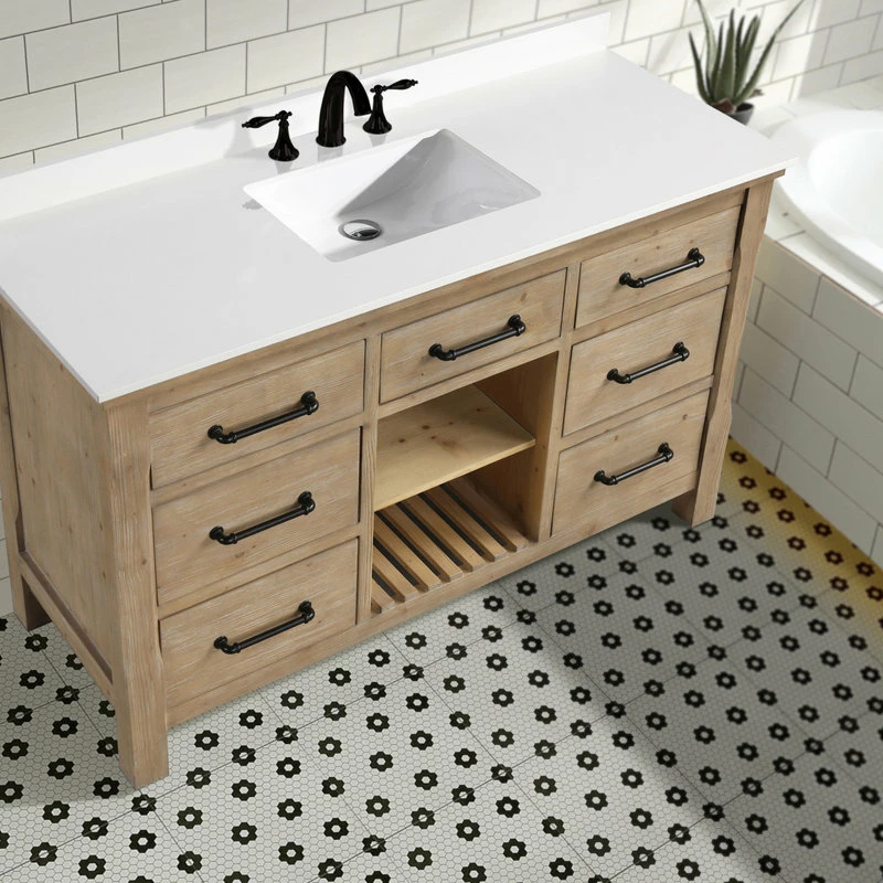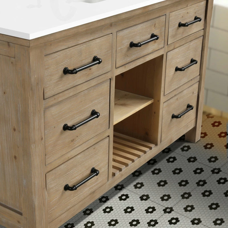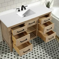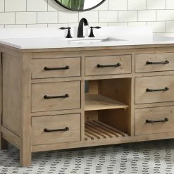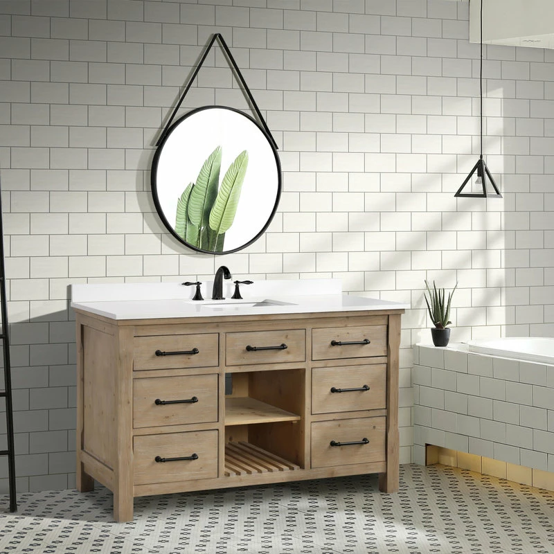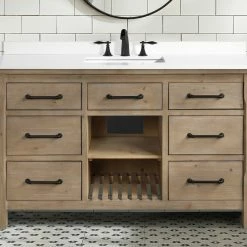 The 55″ Lauren single sink bathroom vanity will be the centerpiece of your bathroom remodel. Skillfully constructed of solid fir wood to last a lifetime. Wood is skillfully finished with raised grain to give a distress and reclaim wood look. Six solid wood dovetail drawers with full extension glides give you all the necessary storage room for your daily toiletries, coupled with a white engineered stone countertop to finish off your farmhouse remodel.