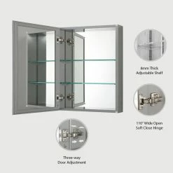 - High-end hardware brand DTC 110ยฐ wide-open soft closed hinges provide strong support for large medicine cabinet.