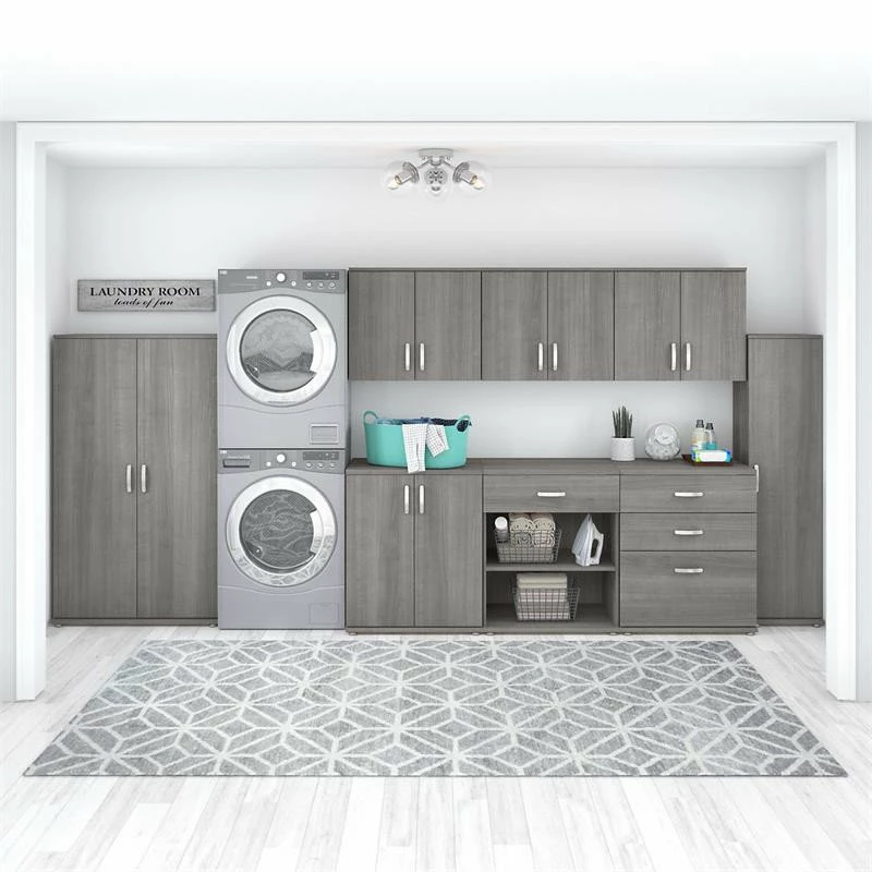 The Bush Business Furniture Universal Laundry Room Wall Cabinet with Doors and Shelves features a commercial quality design that’s built to last and provides ample room for organization. Neatly store laundry detergent, dryer sheets and miscellaneous supplies inside a practical wall mounted cabinet that promises to maintain its contemporary style throughout years of reliable use. Cabinet doors with smooth Euro-style hinges open to reveal one fixed shelf and one adjustable shelf that accommodate items of various sizes. The total weight capacity of the small laundry room wall shelf is 30 pounds. For best use, mount wall studs 16 inches apart during installation. This laundry room cabinet has been meticulously tested to meet or exceed ANSI/BIFMA standards for safety and performance and is backed by a 10 Year Manufacturer’s Warranty. See the full collection for coordinating items available.