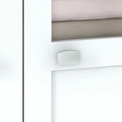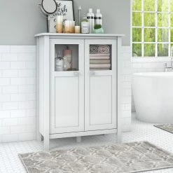 A traditional look with contemporary flair. Organize your everyday essentials with the Bush Furniture Broadview Bathroom Storage Cabinet. With a fashionable and functional design, the 2 door storage cabinet features glass accents and conceals 3 stationary and 4 adjustable shelves. Enjoy a smooth close as the doors feature self-closing Euro-style hinges. Elegant Satin Chrome hardware and a sturdy post leg design complete the beautiful Bathroom Cabinet, finished in White to complement any decor. Backed by a Bush Furniture 1 Year Manufacturer’s Warranty.Two glass accented doors enclose 3 stationary shelves and 4 adjustable shelves