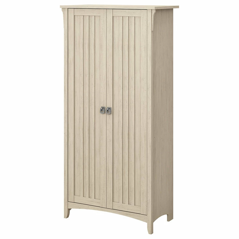 Organize your home’s bathroom with an accent cabinet that combines casual style with a convenient, versatile design. The Bush Furniture Salinas Bathroom Storage Cabinet with Doors features five concealed shelves for keeping cleaning supplies, towels, toiletries and other personal items in order and out of sight. Three adjustable shelves can be moved up or down to accommodate bulkier items while the two remaining shelves are fixed for stability. Each shelf supports up to 25 pounds, so you can confidently store larger containers and bathroom materials. Doors open on smooth Euro style hinges for easy access to contents. Inspired by timeless mission style, this 32W x 16D x 63H tall storage cabinet features tapered legs, curved base rails and decorative wood accents that blend seamlessly with farmhouse and cottage decor. Find the perfect look for your casual home with attractive Antique White, Cape Cod Gray and Vintage Black finishes complemented by Tumbled Pewter hardware. This bathroom organizer is tested to meet ANSI/SOHO quality standards for safety and performance and is backed by the Bush Furniture 1 Year Manufacturer’s Warranty. See the full Salinas Collection for coordinating items to expand your work or living space with the same relaxed charm.