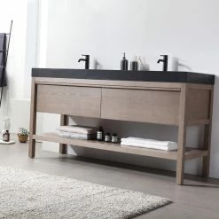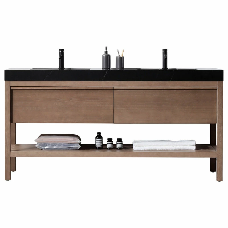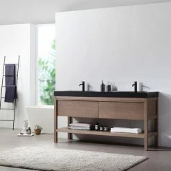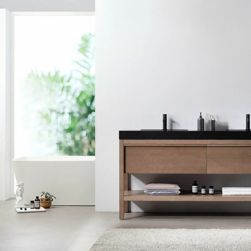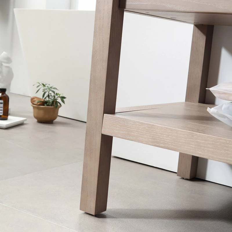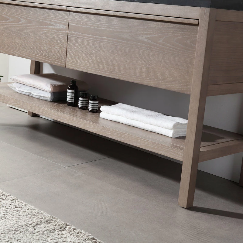Natural artistic characterize the Bibury 72-inch Chestnut oak finishing freestanding bathroom vanity. Featuring original wood pattern and Bulgaria Gray Quartz countertop with sink, this freestanding piece boasts wide handle-less drawers with large open shelving in style. The well-designed series stands out from all bathroom furnitures and gives users best feeling of the luxury experience.