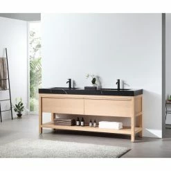 Natural artistic characterize the Bibury 72-inch Whitewash oak finishing freestanding bathroom vanity. Featuring original wood pattern and Bulgaria Gray Quartz countertop with sink, this freestanding piece boasts wide handle-less drawers with large open shelving in style. The well-designed series stands out from all bathroom furnitures and gives users best feeling of the luxury experience.