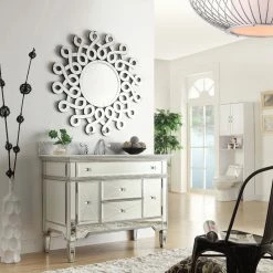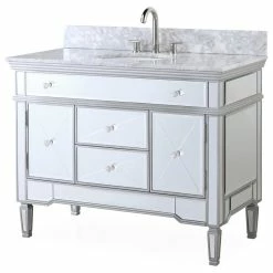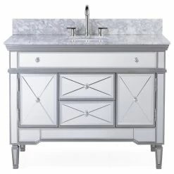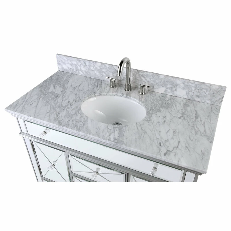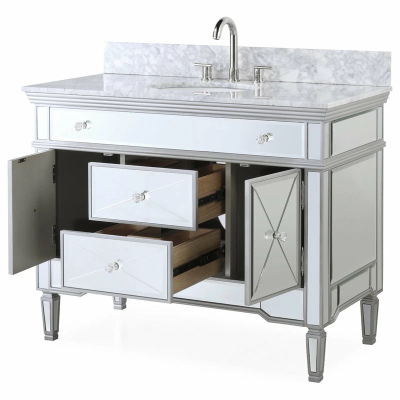 Add a touch of sophistication to your bathroom with the modern Austin sink vanity. In addition its luxurious finish, which is a solid body of beveled glass mirrors, this vanity features a Carrera marble counter-top and double-doors that open into ample storage space and functional drawers. Get started on your bathroom by purchasing the Austin single vanity today.