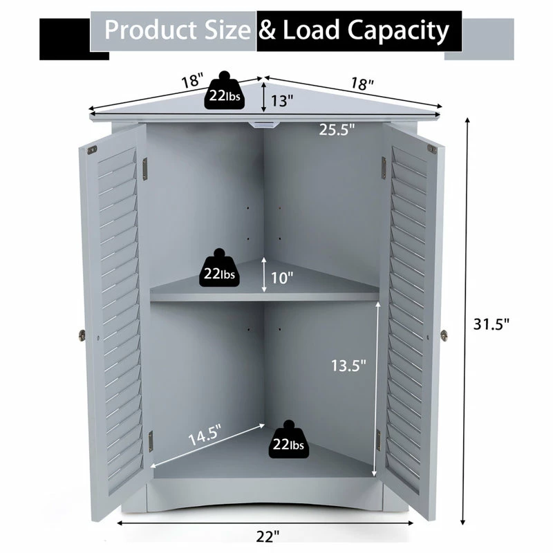 This corner storage cabinet can maximize the utilization in any corner space of your home. Featuring the traditional shutter doors, the storage cabinet not only guarantees good ventilation but effectively stores and classifies your toiletries and towels in order. Made of P2 standard MDF, each shelf of the classic floor cabinet can hold up to 22 lbs, bringing endless charm to your interior space. The adjustable shelf is designed for 5 flexible storage options, perfect to fit the corners and nooks in your home for higher space efficiency. It is easy to assemble and maintain.