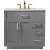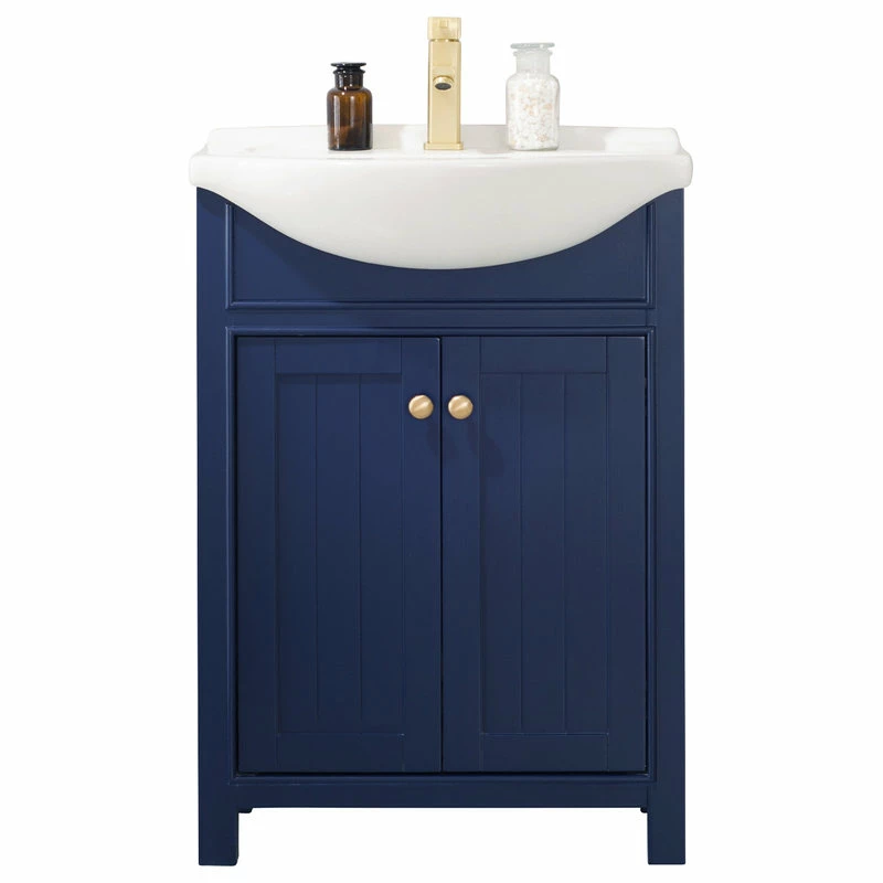 The Marian 24″ Single Sink Vanity by Design Element provides the perfect finishing touch to your bathroom remodel project. Constructed of solid hardwood, this vanity will maintain its beauty and functionality year after year. The porcelain countertop and integrated sink with overflow perfectly matches the styling of the cabinet, and is extremely simple to maintain. Opening the 2 soft closed doors reveals an ample storage space. The included satin gold hardware provides the perfect finishing touch to the blue cabinet. Faucet and drain are not included.