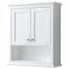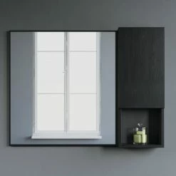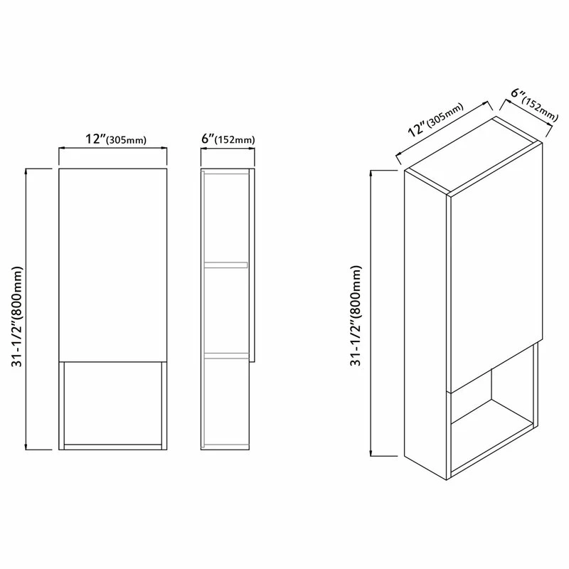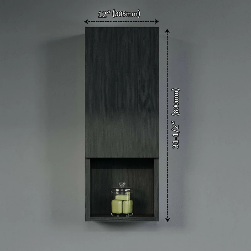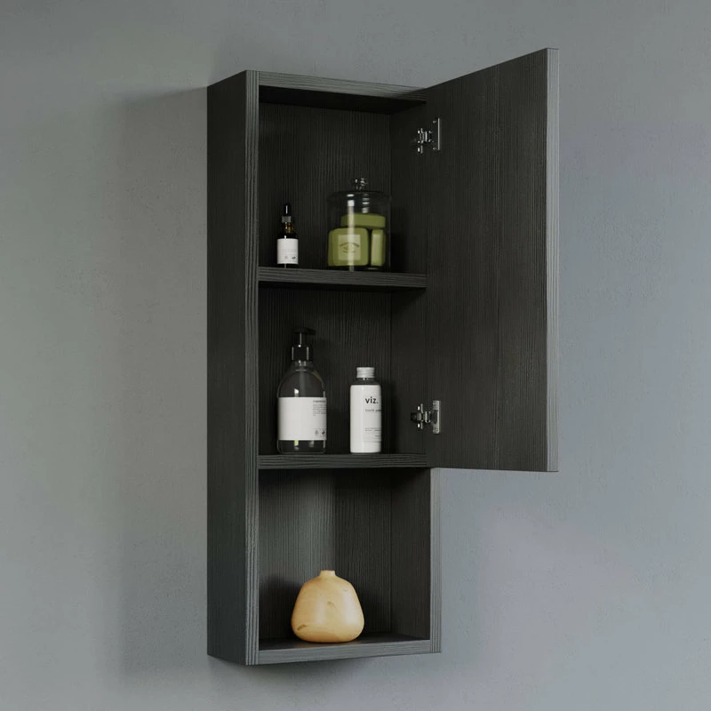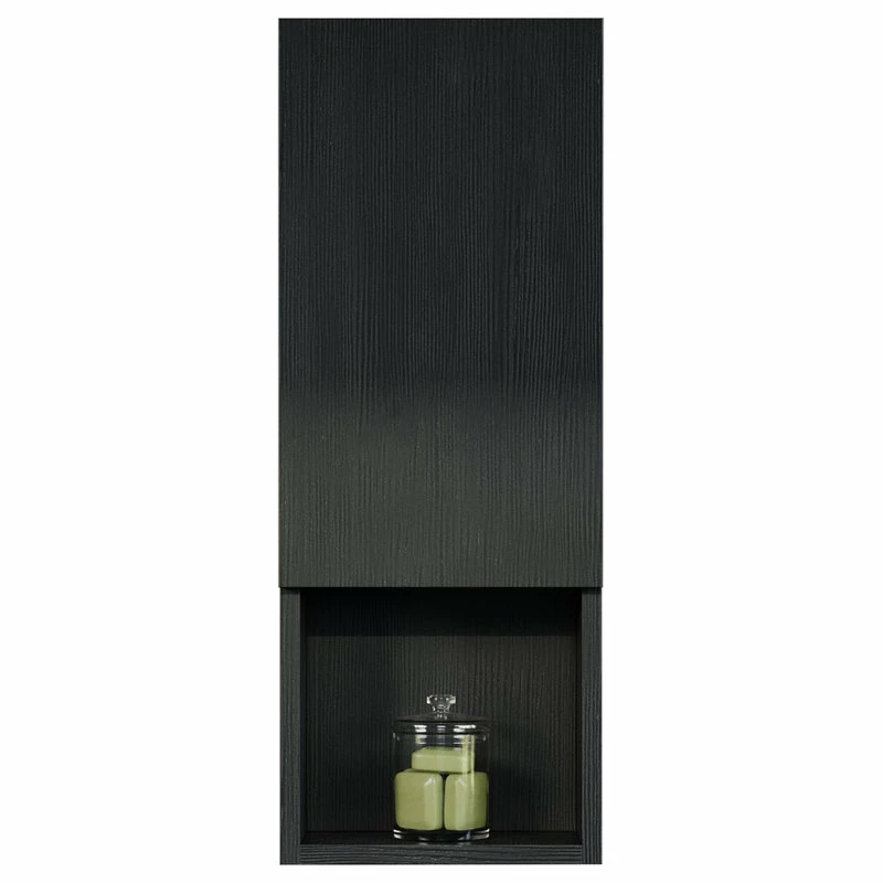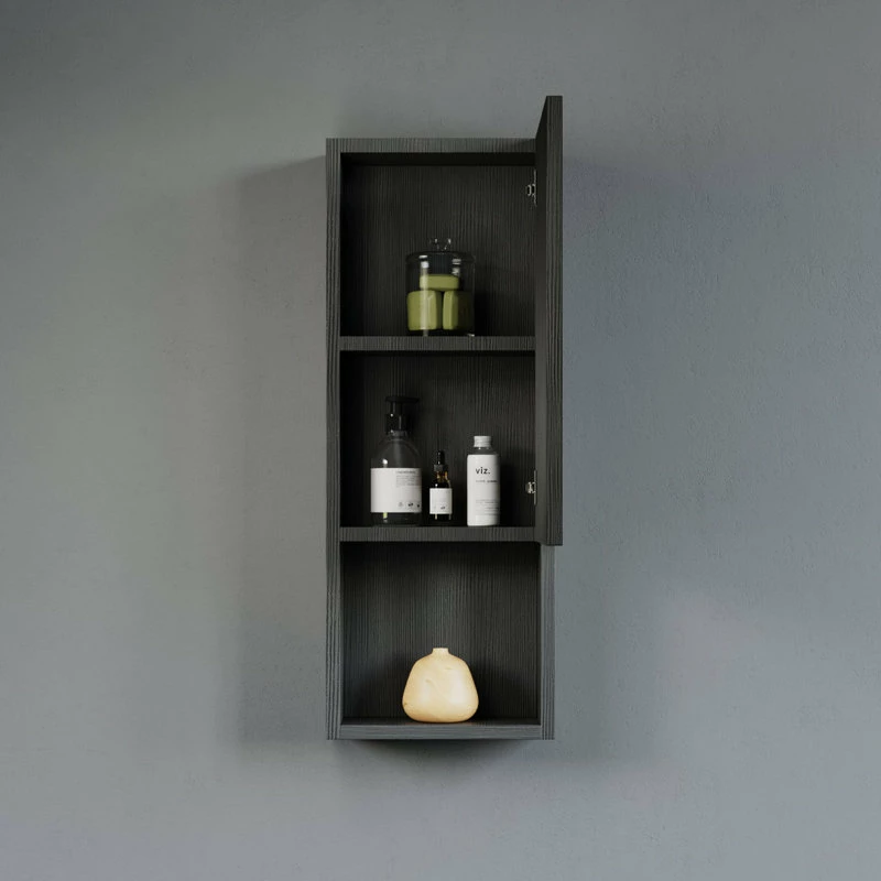 Wall-mounted laminated wood side cabinet with 3 shelves (2 enclosed, 1 open) and one soft close door that can be adjusted to open to the left or right. Works as standalone cabinet or can be paired with a wall mirror, typically above a vanity set. Available in white, black, and cement grey
