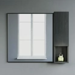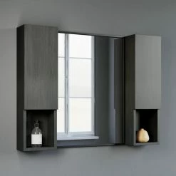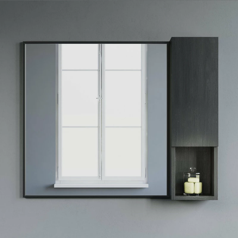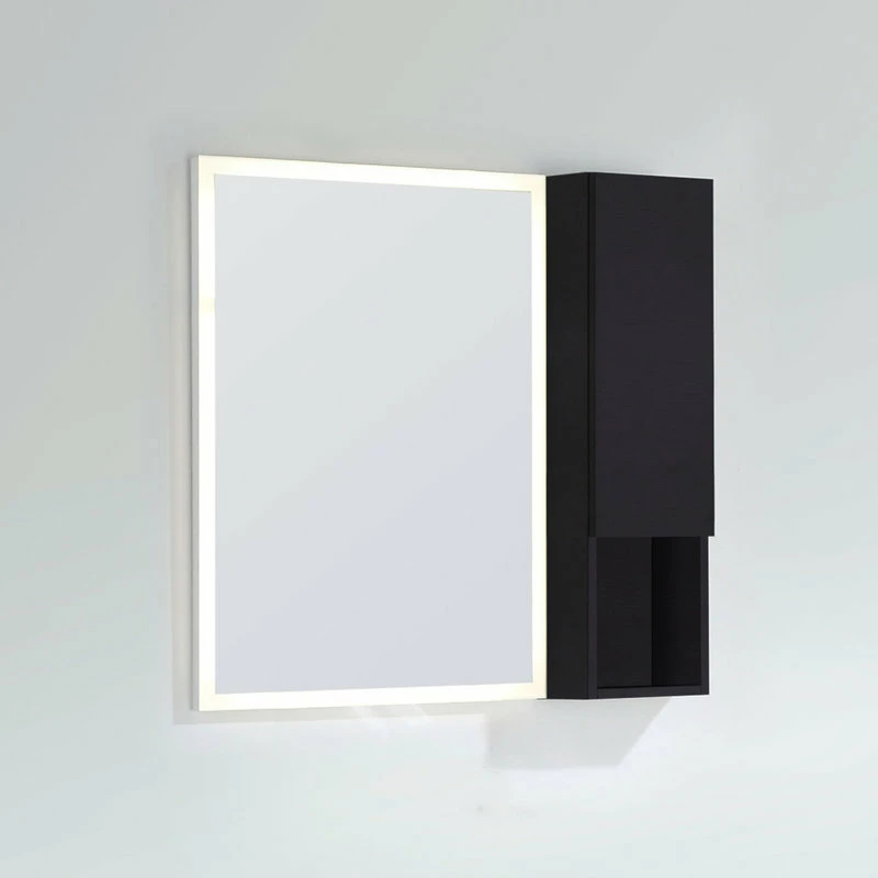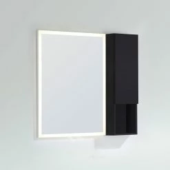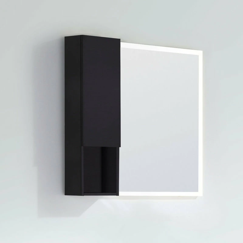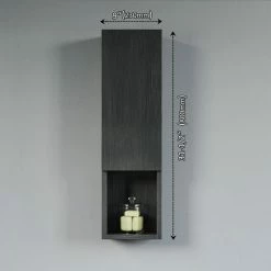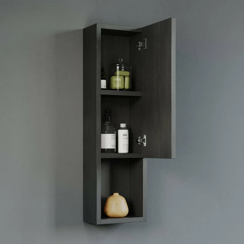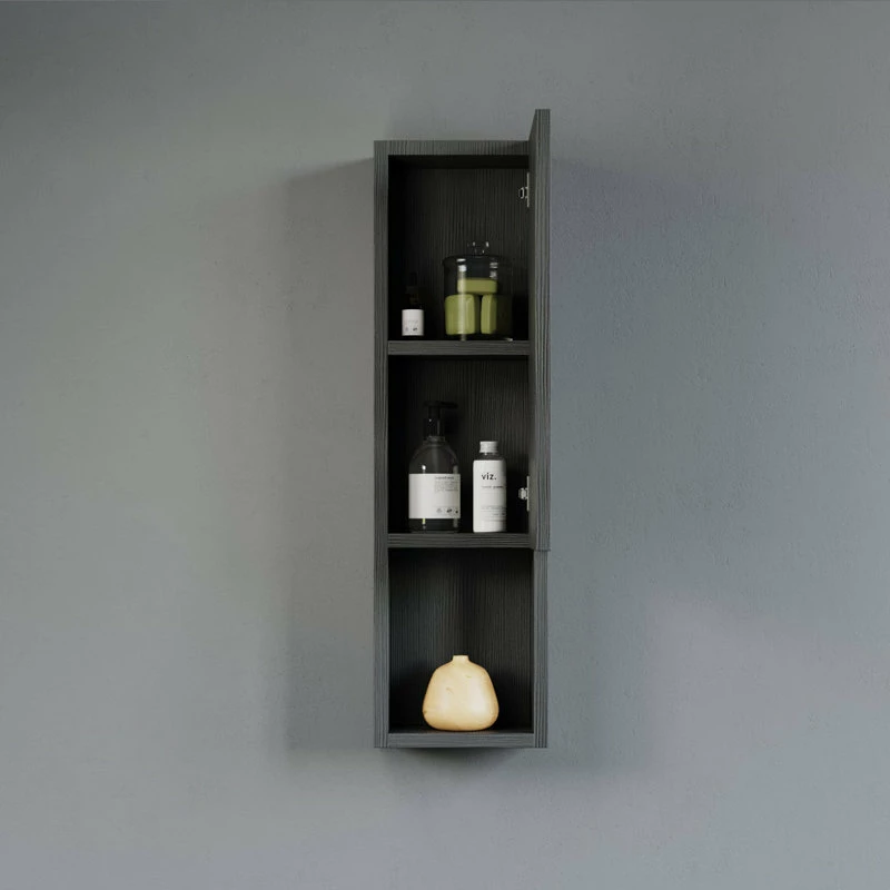 Wall-mounted laminated wood side cabinet with 3 shelves (2 enclosed, 1 open) and one soft close door that can be adjusted to open to the left or right. Works as standalone cabinet or can be paired with a wall mirror, typically above a vanity set. Available in white, tan, black, bluish-green, walnut, and cement grey