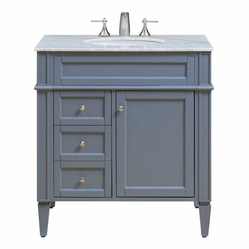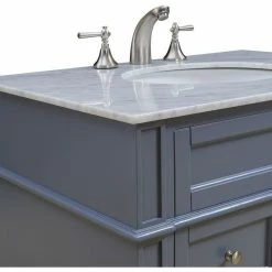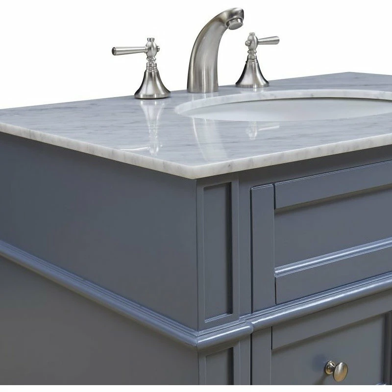 This classic hand painted marble-topped vanity console from our “Park Avenue” collection is roomy enough to keep all your bath essentials close at hand. Fitted with a spacious Italian Carrara white marble counter top and an oval porcelain undermount sink, you’ll naturally enhance your home or office bathroom with both its beauty and practicality. In the hand painted gray cabinet are 2 full-extension drawers and a 1-door cabinet space, each of which are accented with brushed steel knobs. This contemporary vanity console’s simple, straight-line designed cabinet sits atop four graceful tapering legs, Please note that due to the natural characteristics of the stone, the color and/or pattern of each countertop may vary from the pictures. No two slabs of marble are the same!- Measurements: W32″ x D21-1/2″ x H35″ – Authentic Carrara white marble counter top imported from Italy – Pre-drilled faucet holes, 8″ spread – Under mount porcelain sink – Constructed of kiln dried solid wood and MDF – 1 soft-closing door with 1 shelf inside – 2 full extension drawers — the lower drawer is deeper for easy-access, extra storage – Faucets shown are not included. Minor assembly of legs required.