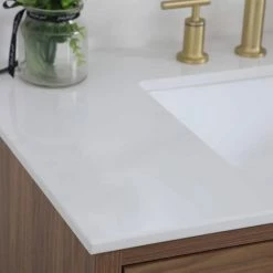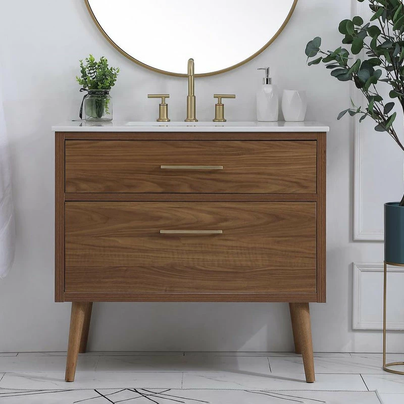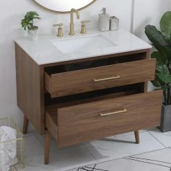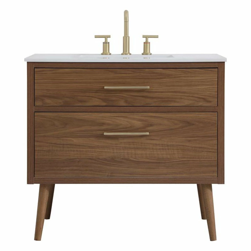 Delve into a world of minimalistic fashion and contemporary styling with this midcentury modern 36″ vanity. The clean lines anchors the design, while the oblique tapered cylinder legs add subtle interest. However, the artful juxtaposition between the walnut brown and matte white creates a blend of bright modernity and classical traditions. A gold handle adorns the top fake drawer hiding the base of the integrated porcelain sink while another one allows you to pull the bottom drawer out, letting you store your bathroom necessities and toiletries. The compact size makes it the perfect vanity for any bathroom or powder room, regardless of size.