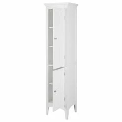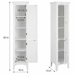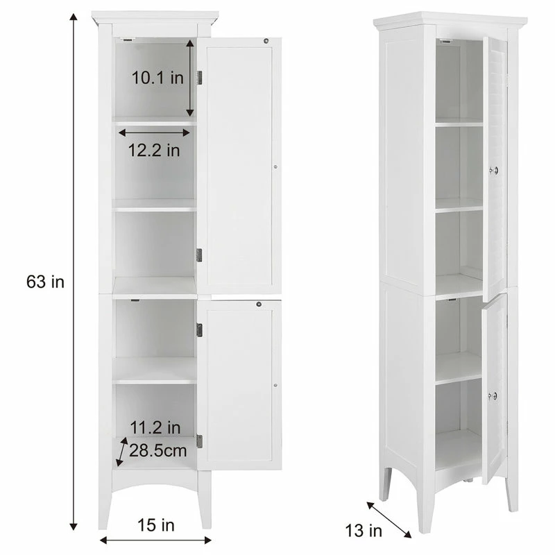 Upgrade your home storage while adding classic style with the Elegant Home Fashions Glancy Wooden Tall Tower Cabinet with Storage. This decorative cabinet features a timeless white finish with a crown molded top and skirting, chrome-finished knobs, louvered doors, and both shaker-style and arched legs for a beautiful addition to your space. The double-tier louvered doors house 4 interior shelves, with 3 tiers on the top and 2 on the bottom for a functional storage solution. Constructed from durable engineered wood with included anti-tipping hardware, this storage unit is built to provide you with long-lasting organization. Easy, step-by-step instructions and all of the hardware needed for installation are included for quick assembly. Purchase this stylish tower cabinet alone or with other items from the Glancy collection for a cohesive, updated look. The Elegant Home Fashions Glancy Wooden Tall Tower Cabinet with Storage measures 15″ x 13″ x 63″ to provide accessible storage without taking up too much space in your living area or bathroom.