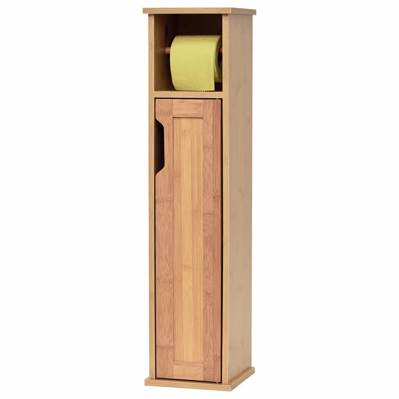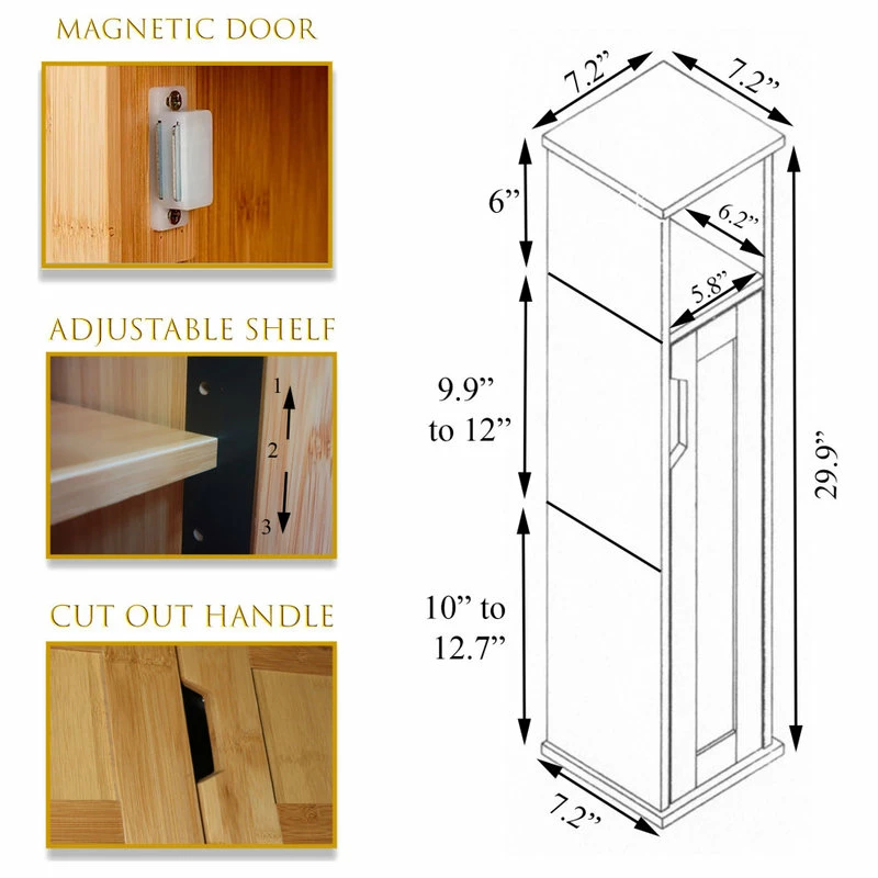 - HIDDEN STORAGE SPACE: Behind the bamboo door, store easily rolls and bath accessories. Inside, a removable bamboo shelf is adjustable in height (3 positions available)