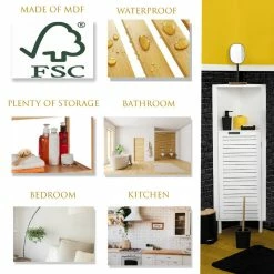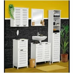 - HIDDEN STORAGE SPACE: Behind the white-colored louvered door, store easily rolls and bath accessories. Inside, a removable white shelf is adjustable in height (3 positions available) to store items in varied sizes