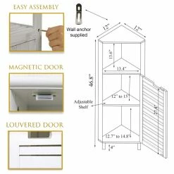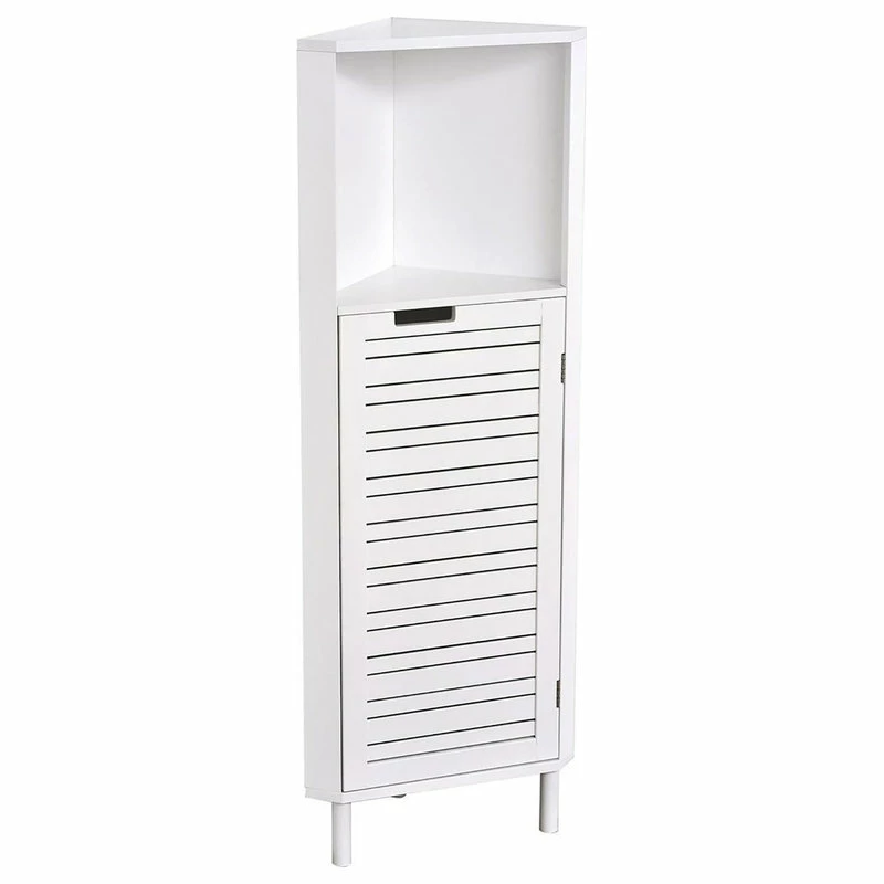 - MADE OF WOOD/MDF : This bathroom corner cabinet is made of white painted sturdy wood (MDF). The door has an easy opening with a U-shape cutout handle. Also, the louvered door ensures a good air flow and is magnetized to stay securely closed