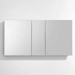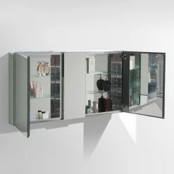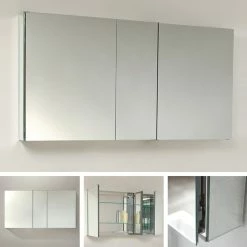 This 50″ medicine cabinet features mirrors everywhere. The edges have mirrors and also on the interior of the medicine cabinet. The inside features four tempered glass shelves. Can be wall mounted or recessed into the wall.