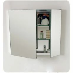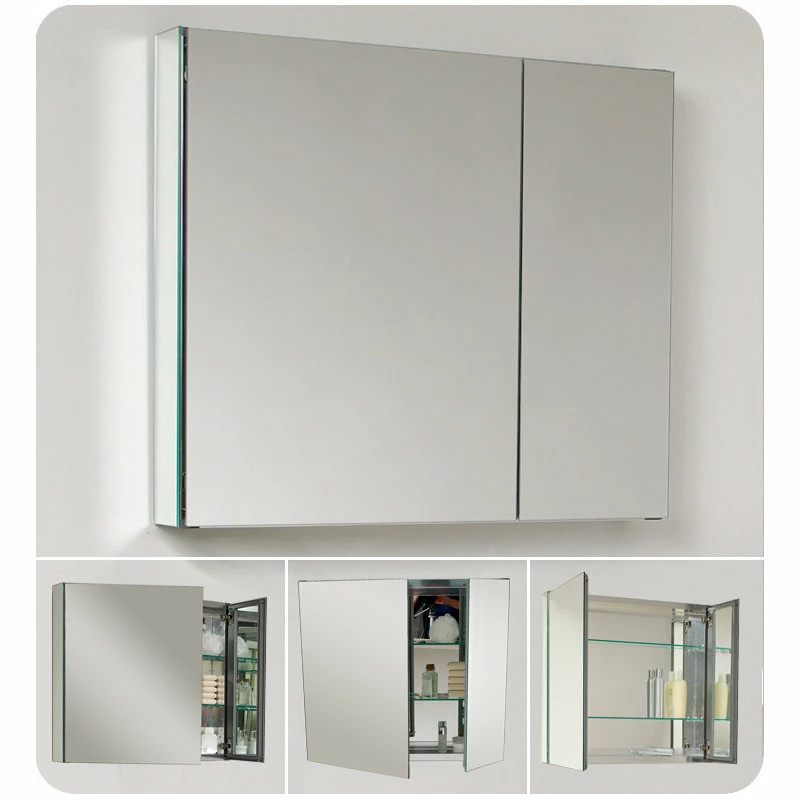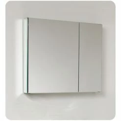 30″ Double Door Frameless Medicine Cabinet with Two Glass Shelves and Recessed Mounting OptionThis 30″ medicine cabinet features mirrors everywhere. The edges have mirrors and also on the interior of the medicine cabinet. The inside features two tempered glass shelves. Can be wall mounted or recessed into the wall.Features: