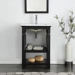 Brighten your bathroom or powder room with the clean, timeless design of our Fresca Manchester 24″ Traditional Bathroom Vanity. This beautifully constructed vanity features panelled solid wood doors with innovative soft close hinges to ensure they close silently and effortlessly every time. Designed to complement any decor scheme, this traditional vanity features a chic, painted Black finish and brushed nickel handles. An open bottom shelf is ideal for storing towels and additional bath supplies. A lovely white ceramic sink with rounded basin adds to the vanity’s clean aesthetic. It is equipped with an integrated overflow and single hole faucet mount. This stylish vanity is offered in a choice of several finishes. It includes installation hardware and is also available in a 30″ size. The matching Fresca Manchester Black Traditional Bathroom Mirror (sold separately) completes the look.