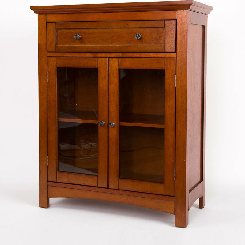 The wooden floor storage cabinet features a glass door and a drawer in a brown finish.The cabinet’s classic design offers ample storage, wooden glider drawer allows for easy open and close. Made of sturdy MDF wood and handcrafted with care. It measures 25.6″L*12.6″W*32″H. Perfect for TVs steroes, lamps and other items to show off or store your china and cutlery for the dining room.