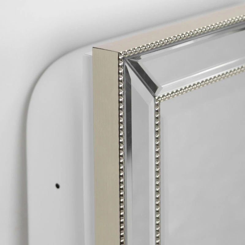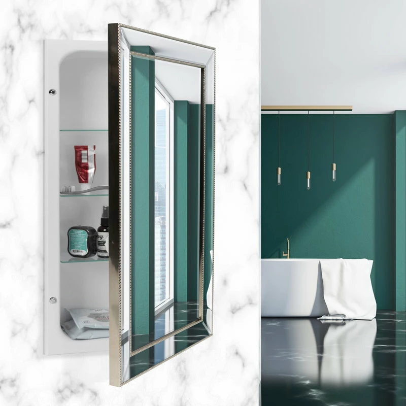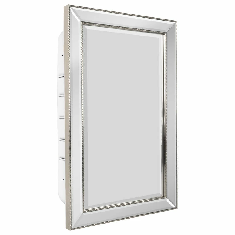 DECORATIVE AND FUNCTIONAL WALL MIRROR – This luxurious beveled mirror cabinet, inlaid with champagne silver beading, combines fashion and function into one eye-catching and convenient piece.