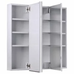 Our Tri-View Series medicine cabinets provide solutions for all your storage and styling needs. Three equal sized mirror doors open to a full size body with plenty of storage space. The doors open to provide you with a 180ยฐ view. These cabinets have a pan door construction and are mounted on soft close gravity hinges that close by using the weight of the door as a constant force. This style hinge allows the door to pivot over the body of the cabinet, and allow six way door adjustment. The cabinets are equipped with rubber door silencer pads.