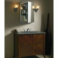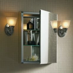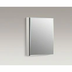 This mirrored cabinet features a 1/2″ beveled frameless door that can be installed with a left or right hinge. Inside, two adjustable 1/4″ glass shelves hold all your toiletries and bath items in front of a beautifully mirrored rear wall. Rust-free aluminum construction ensures years of use, and installation has never been easier with the included side kit, allowing for either recess or surface-mount installations.Features: