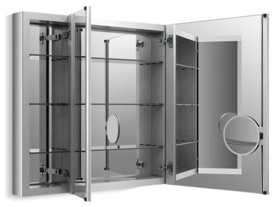 The Verdera medicine cabinet combines an elegant fit and finish with quick, easy installation. Triple mirrored doors create a light-filled gallery effect, opening to a fully mirrored interior with three adjustable glass shelves. A built-in magnifying mirror on the inside of the door is vertically adjustable to accommodate users of varying heights. Slow-close doors create a quieter bath environment.