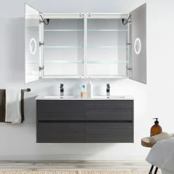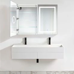 Our LED Medicine Cabinet is a symphony of design elements. We’ve combined our most powerful lighting advancements to create a beautiful storage solution – an expression of luxury and function for your bath. From a distance, the LED border produces a striking, modern glow. Up close, enjoy unparalleled light dispersion on the face and body. Effortless to use, a revolutionary touch icon is integrated into the mirror face for seamless on/off toggling and dimming with memory functionality.