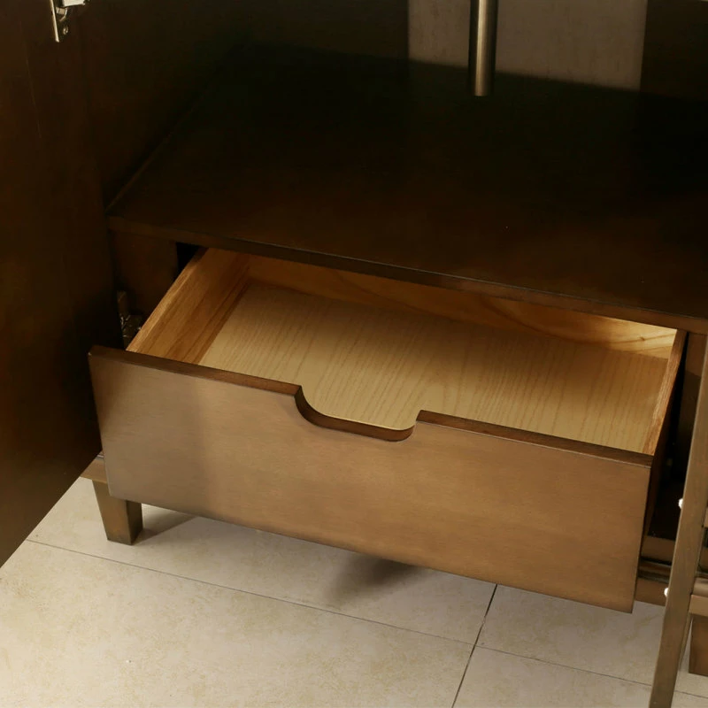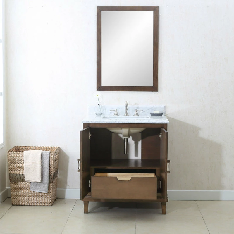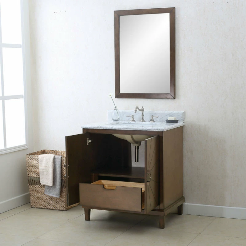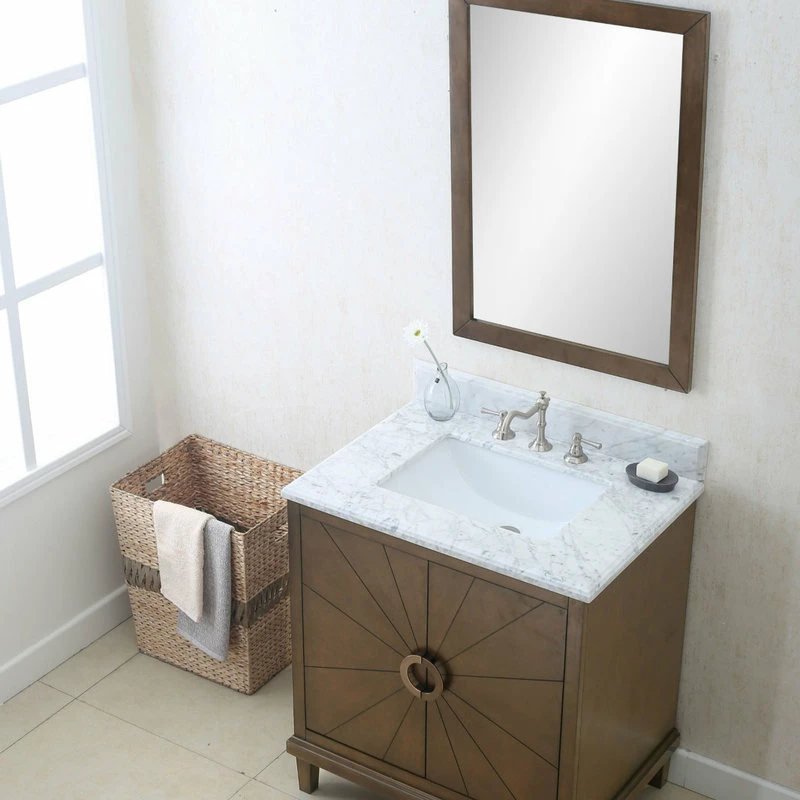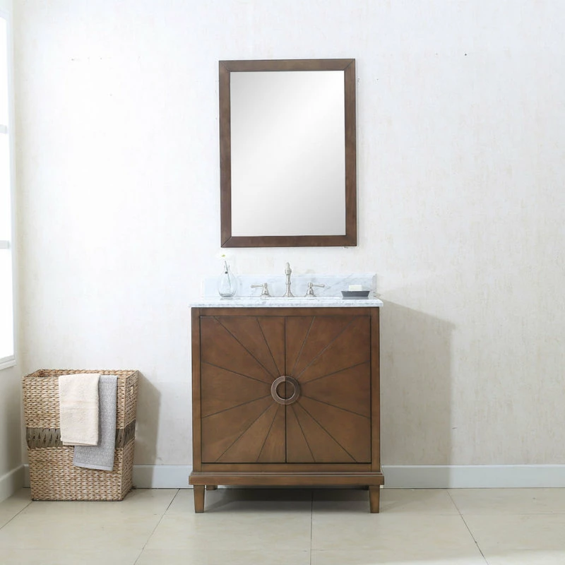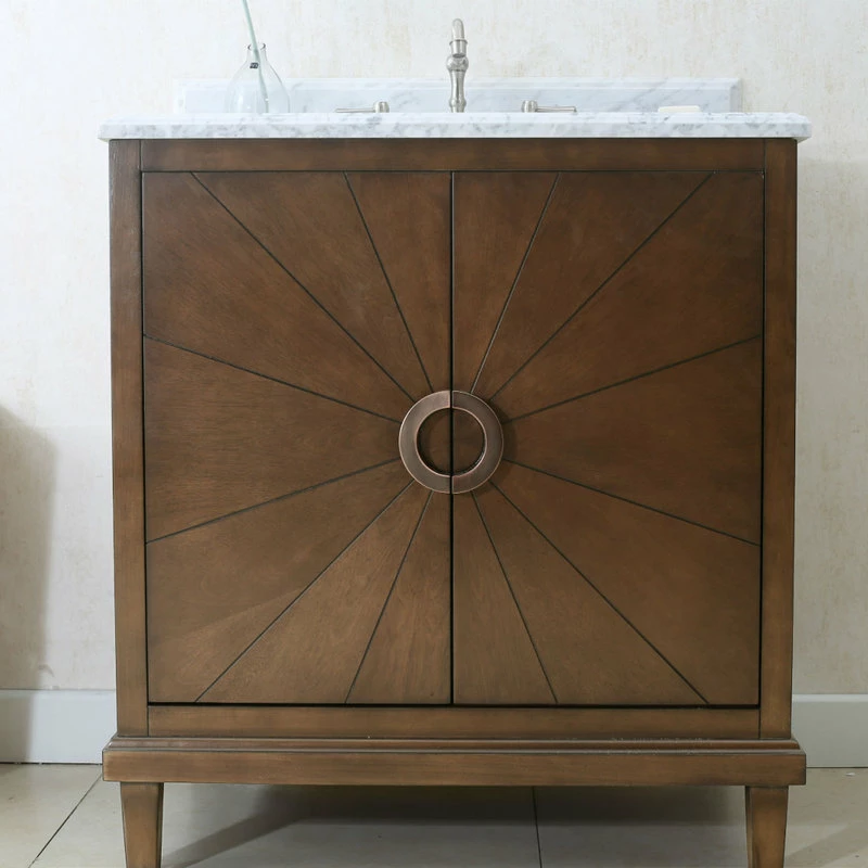 Spruce up your powder room or en suite with the stunning Tristan Bathroom Vanity. The radial design on the cabinet doors brings a sunny touch to your bath. Complete with decorative metal handles and a sleek white Carrara marble top, this bathroom vanity is guaranteed to leave a lasting impression.