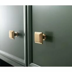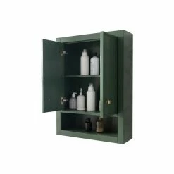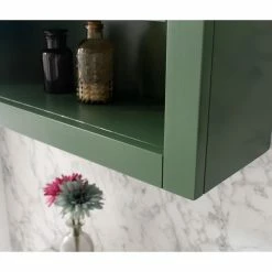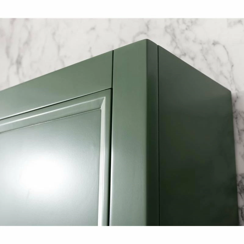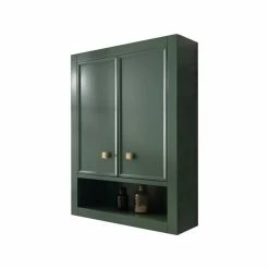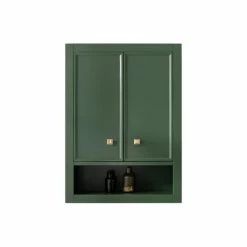 - Cabinet’s rich green finish with gold hardware adds to any bath decor