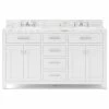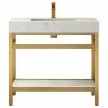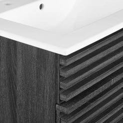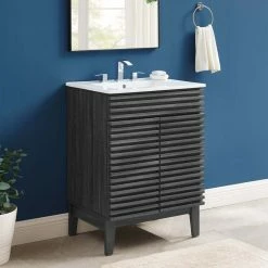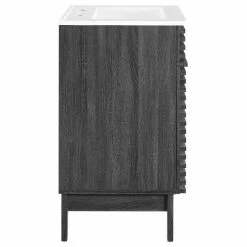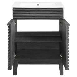 Tap into mid-century aesthetics with the Render Vanity. Render Bathroom Vanity features a durable particleboard frame with smooth walnut grain laminate, four tapered wood legs, and adjustable storage shelf behind two soft-close hinged doors. A curved basin and integrated countertop with three faucet holes create sleek lines and crisp design for an edgy style designed to meet your needs. Boasting a mid-century modern style this vanity features a solid construction with a pleasing look and practical functionality. 8″ centerset faucet holes. Assembly required and fixtures not included.