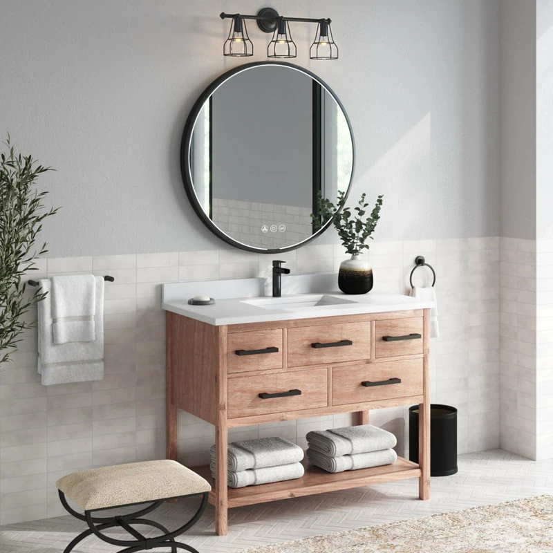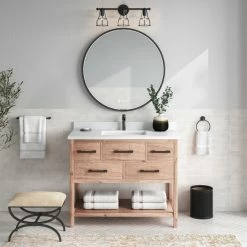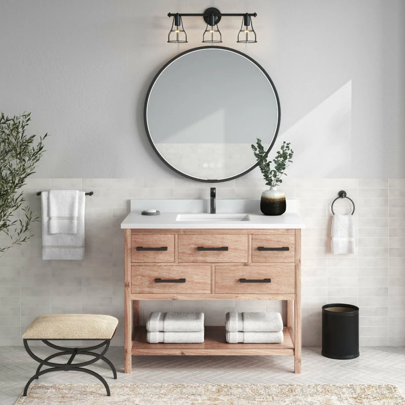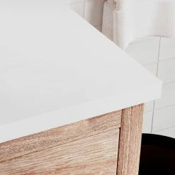 - Wood finished to prevent warping, cracking and withstand bathroom humidity levels