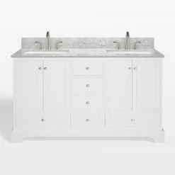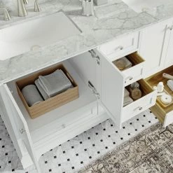 The Cascade Vanity is a transitional piece built with solid wood and natural stone that perfectly balances classic elegance and modern functionality. It’s structured with soft close drawers and cabinets to keep your bathroom tranquil at all times, while the traditional, handcrafted French exterior comes to life with dovetail drawers and durable, built-in legs.