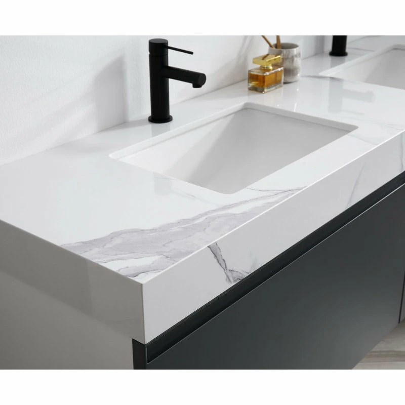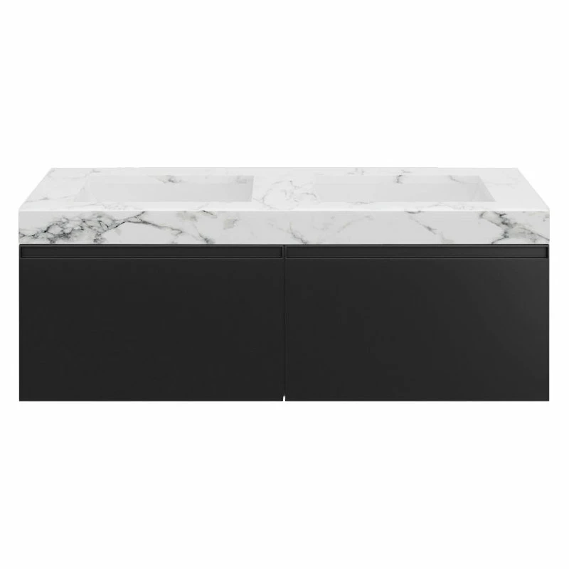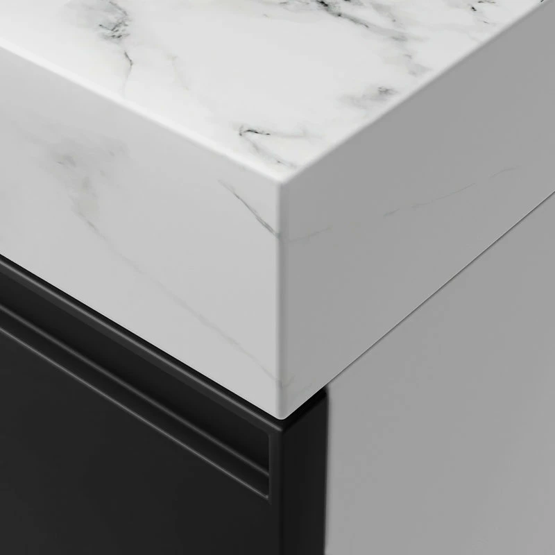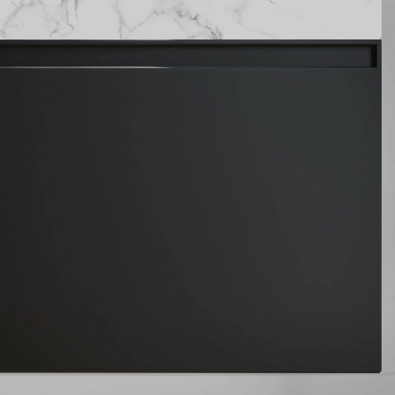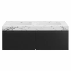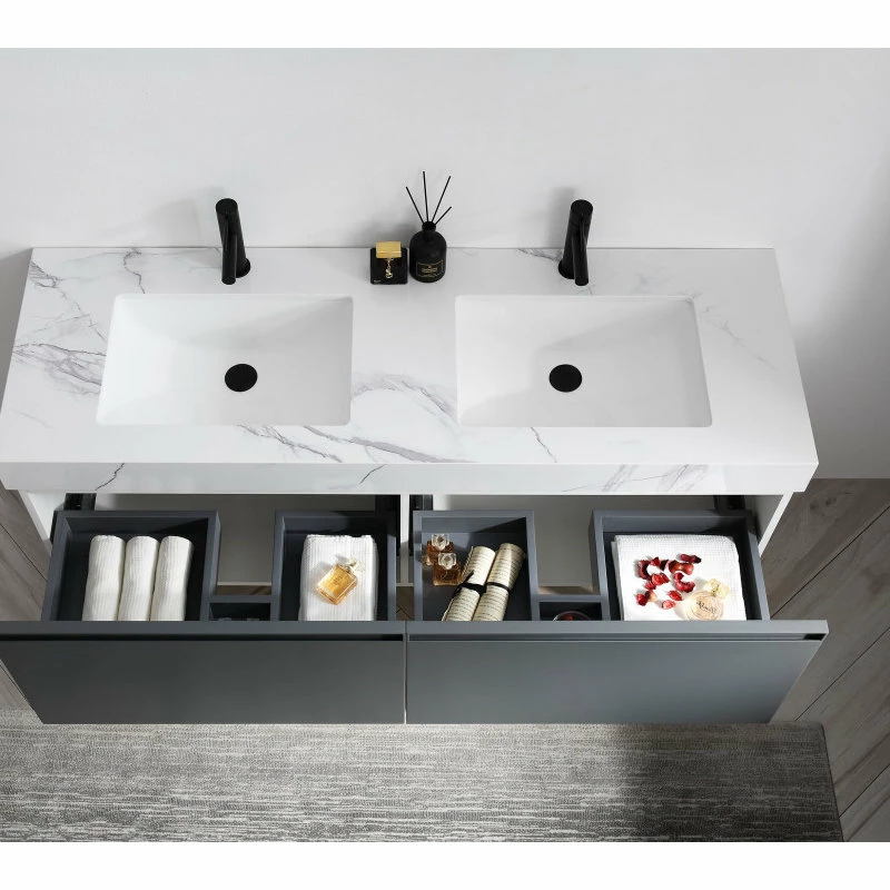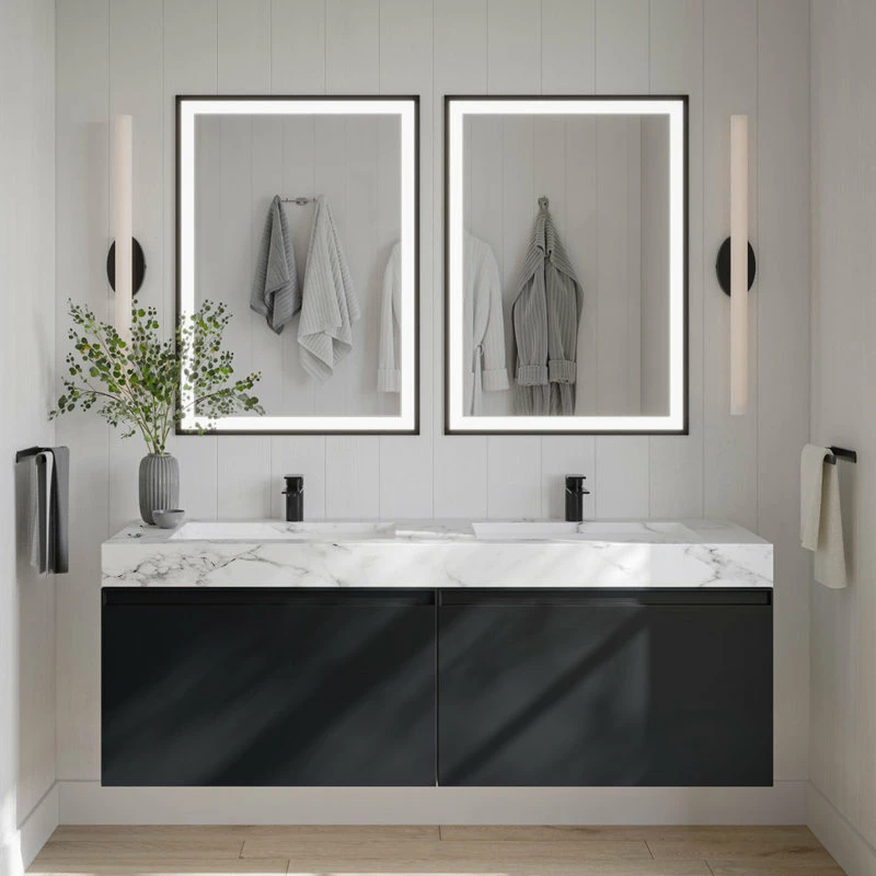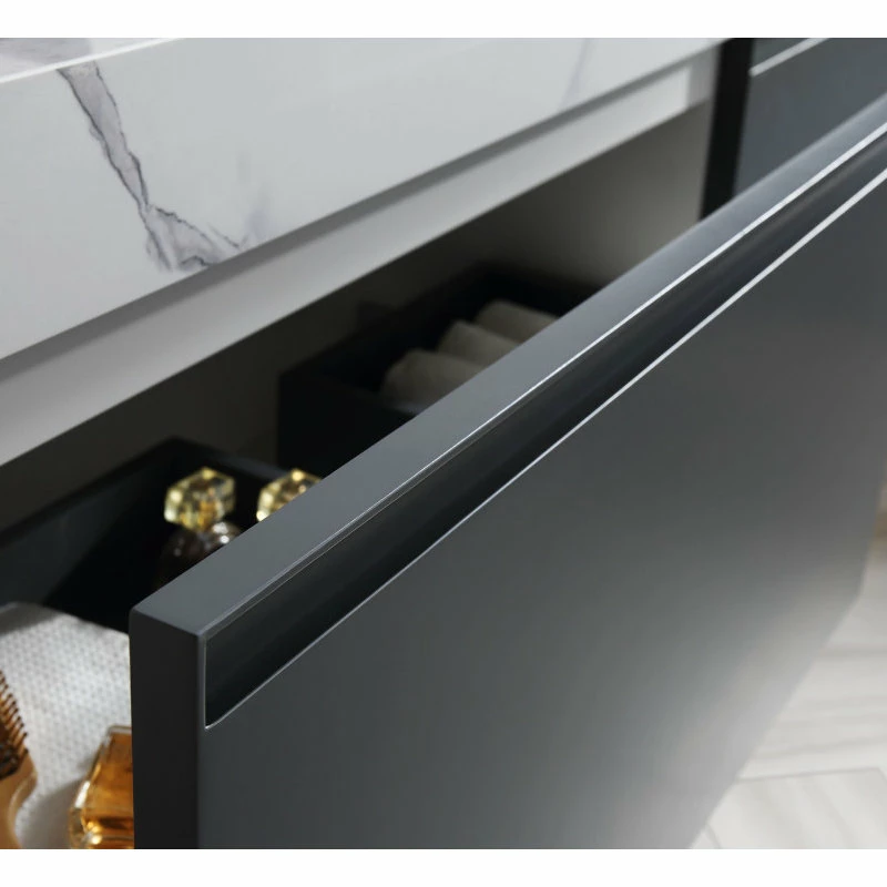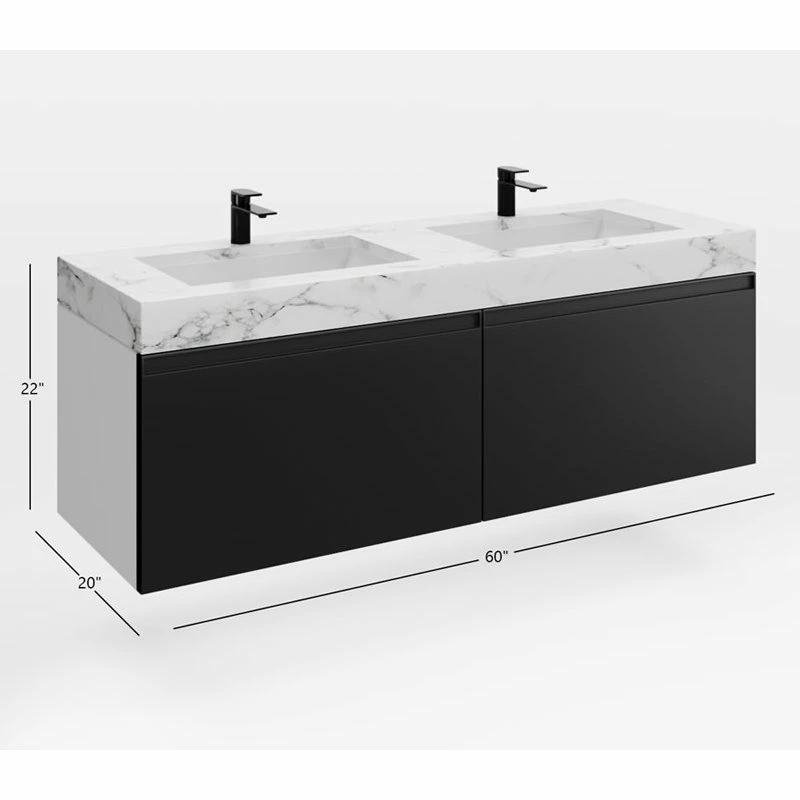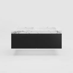 The Monolith floating vanity from MOD adds a bold, strong look to any bathroom. 60 in length, this vanity boasts two basins set into a stout white and gray quartz premium countertop that is nothing if not a sleek and modern contrast to the dark matte gray cabinetry. Undercounter storage is easily accessible via two pull out shelves, each 30 inches across for ultimate organization.
