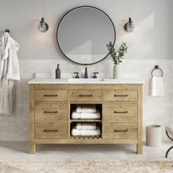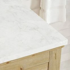 Revitalize your bathroom with the Rawley 55″ single sink vanity. This hand-crafted, eye-catching centerpiece is built to last a lifetime, with its authentic Italian Carrara marble countertop effortlessly supported by a sturdy and warm solid fir wood base. Each drawer is ready to house any bathroom essentials that need a home thanks to its expertly crafted,long lasting dovetail joints. There’s no denying that this rustic, freestanding vanity is built to be the star of any farmhouse remodel.