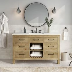 Revitalize your bathroom with the Rawley 55″ single sink vanity. This hand-crafted, eye-catching centerpiece is built to last a lifetime, with its authentic Italian Carrara marble countertop effortlessly supported by a sturdy and warm solid fir wood base. Each drawer is ready to house any bathroom essentials that need a home thanks to its expertly crafted,long lasting dovetail joints. There’s no denying that this rustic, freestanding vanity is built to be the star of any farmhouse remodel.