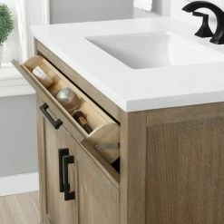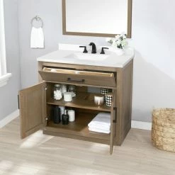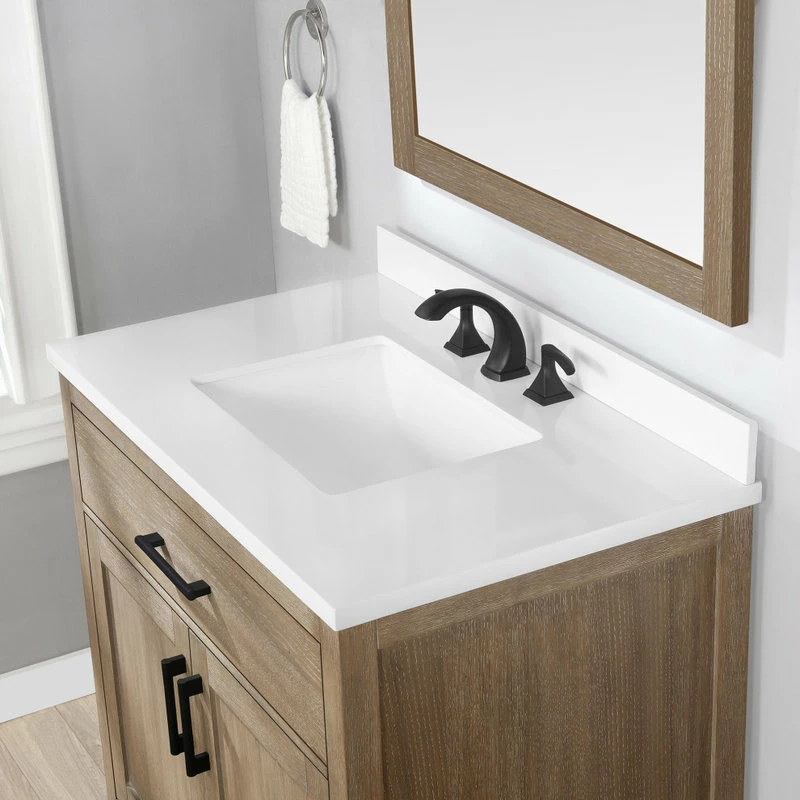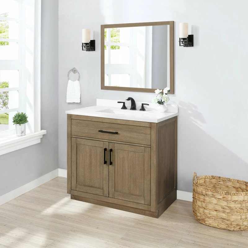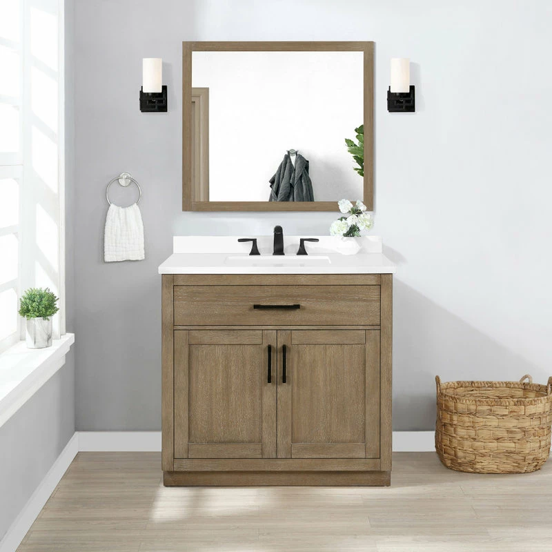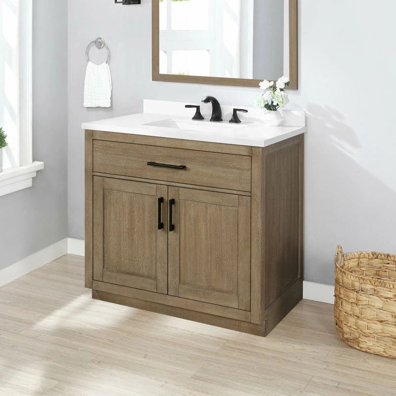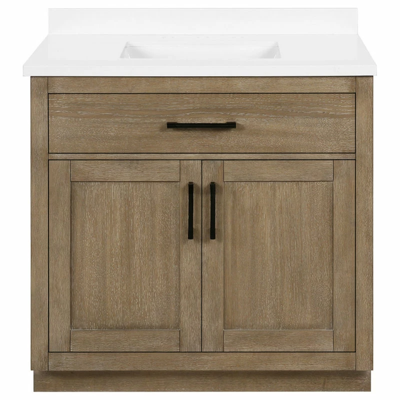 - Freestanding, solid wood bathroom vanity with engineered quartz countertop