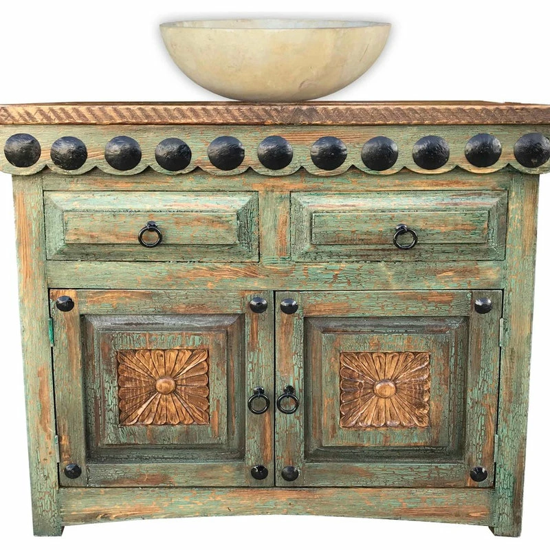 - This beautiful southwestern vanity is hand crafted with kiln-dried solid wood, double doweled at joints. Crackel Turquoise finish detailed with hand made carving on panel. Reclaimed wood on top, covered with polyurethane.