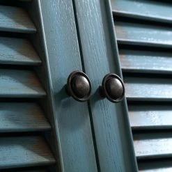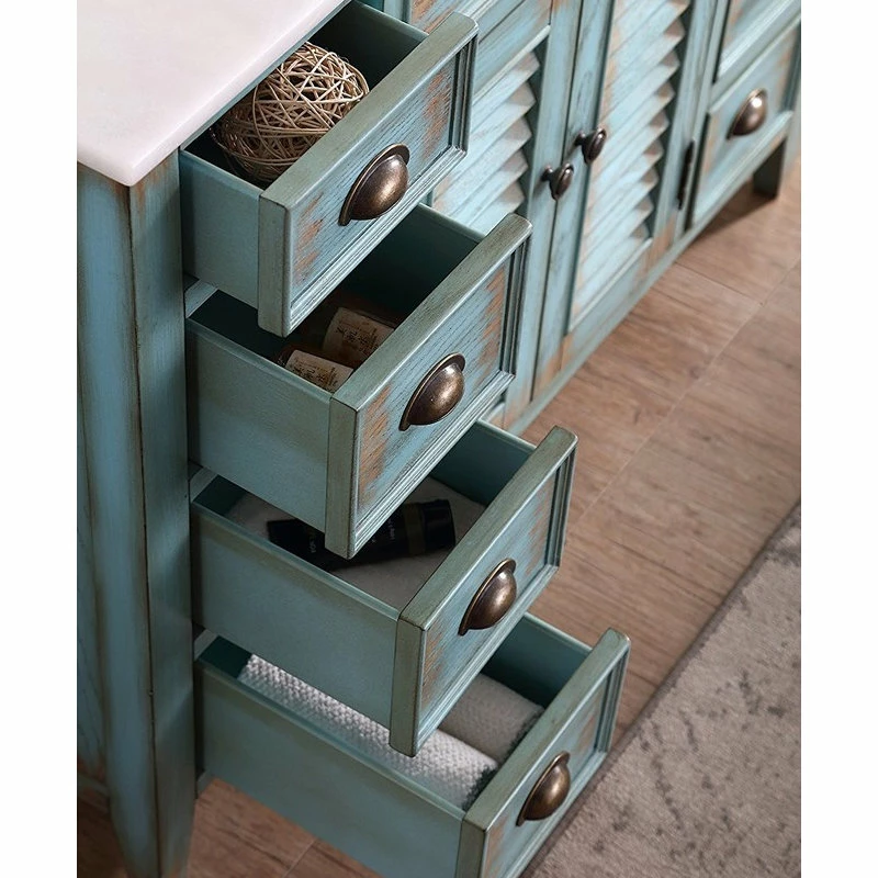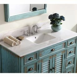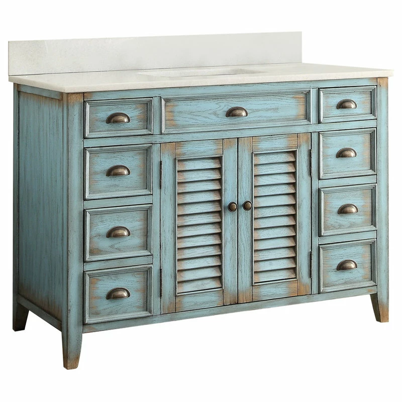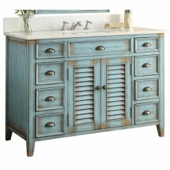 - The plantation-inspired look of this cottage-style sink cabinet will add casual elegance to any bathroom decor. Shutter-style door with antique blue finish, this bathroom vanity offers a look that will create a relaxing retreat in any home.