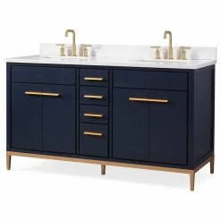 - Materials: Plywood with veneer, quartz stone counter-top, ceramic sinks with overflow