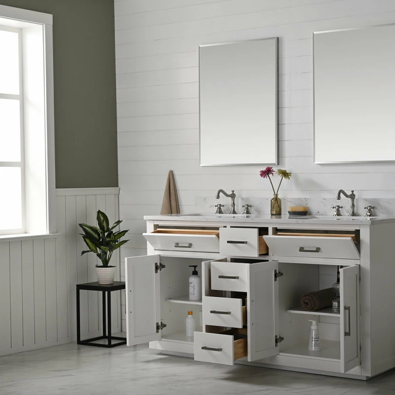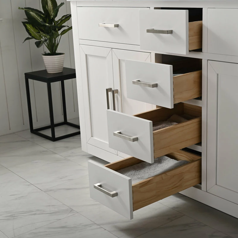 The Grace Bathroom Vanity Collection was inspired by the 1950โs era minimalist design that captures clean lines, crisp geometry and contrasting use of mix material and color pertaining to that period. Premium quality construction detailed with a rich Antique Gray Oak, Navy Blue or White color. Meticulously handcrafted and hand finished. Designed with a Plinth Base that creates an illusion of a floating effect. Features dovetail joints, soft-closing drawers and doors and many higher-end options. Available in 42โ, 48โ and 60โ