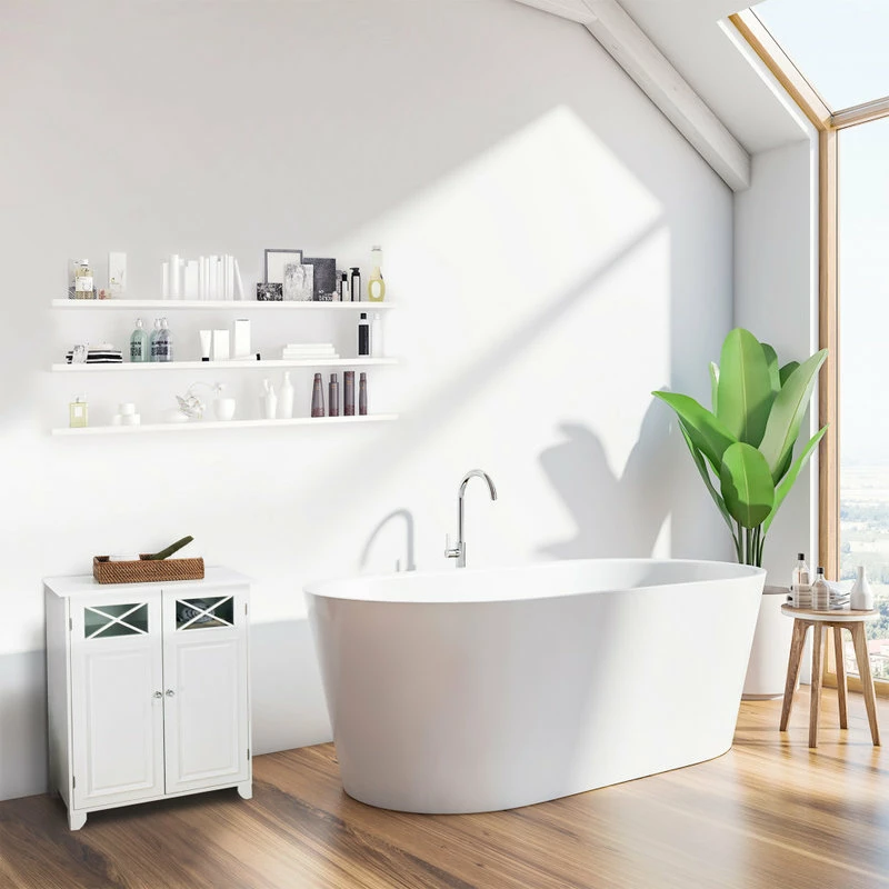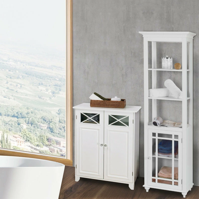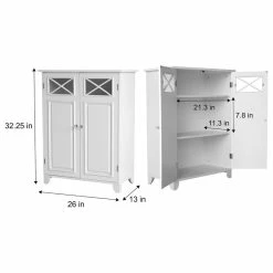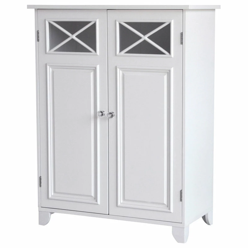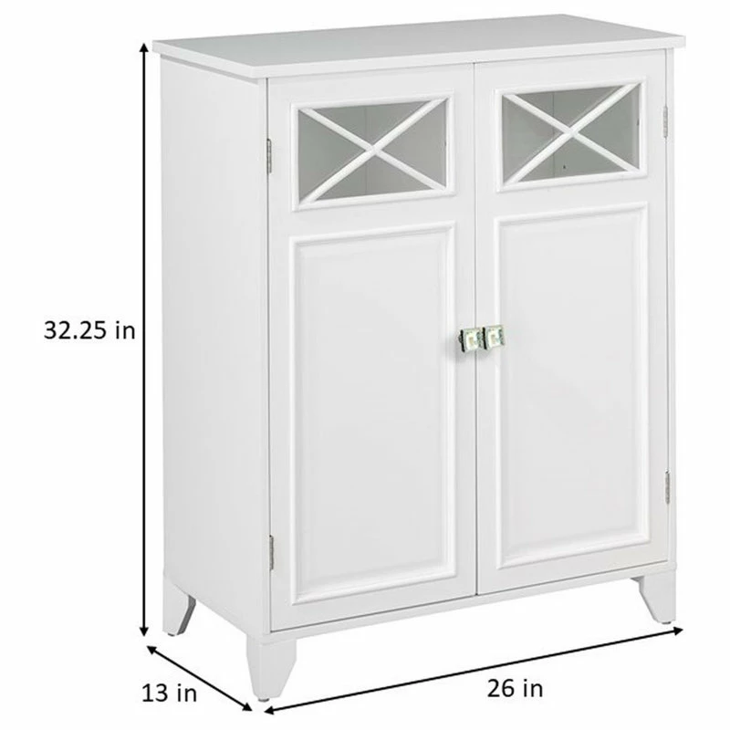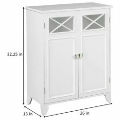 Upgrade your home storage while adding classic decor with the Elegant Home Fashions Dawson Wooden Floor Cabinet with Cross Molding and 2 Doors. This decorative cabinet features a white finish with cross molding on the glass-paneled doors and clear knobs for a beautiful addition to your space. The included fixed shelf and adjustable shelf help to reduce clutter and keep your home tidy. Constructed from durable engineered wood, this floor cabinet is built to provide you with long-lasting organization. Easy, step-by-step instructions and all of the hardware needed for installation are included for quick assembly. Purchase this stylish cabinet alone or with other items from the Dawson collection for a cohesive, updated look. The Elegant Home Fashions Dawson Wooden Floor Cabinet with Cross Molding and 2 Doors measures 13″ x 26″ x 34″ to provide accessible storage without taking up too much space in your living area or bathroom.