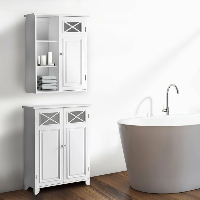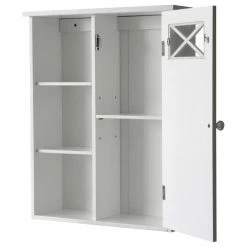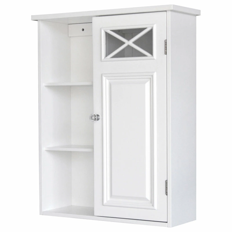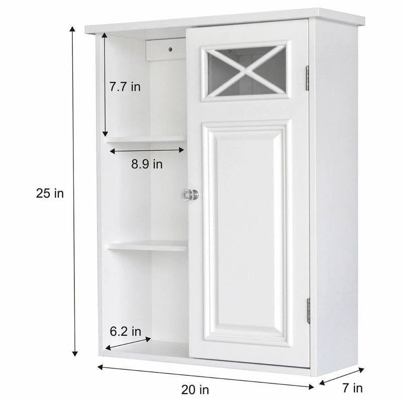 Upgrade your home storage while adding classic decor with the Elegant Home Fashions Dawson Wooden Removable Wall Cabinet with Cross Molding. This decorative cabinet features a white finish with cross molding on the glass-paneled door and a clear knob for a beautiful addition to your space. The 2 included fixed open shelves and adjustable interior shelf help to reduce clutter and keep your home tidy. Constructed from durable engineered wood, this removable wall cabinet is built to provide you with long-lasting organization. Easy, step-by-step instructions and all of the hardware needed are included for quick assembly. Purchase this stylish cabinet alone or with other items from the Dawson collection for a cohesive, updated look. The Elegant Home Fashions Dawson Wooden Removable Wall Cabinet with Cross Molding measures 7″ x 20″ x 25″ to provide removable storage without taking up too much space in your living area.