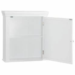 Upgrade your home storage while adding classic decor with the Elegant Home Fashions Chestnut Wooden Medicine Cabinet with Crown Molded Top. This decorative cabinet features a white finish with a crown molded top, a mirror door, double-plated knobs, and stylish columns with 3 grooves for a beautiful addition to your space. The included adjustable shelf helps to reduce clutter and keep your home tidy. Constructed from durable engineered wood, this medicine cabinet is built to provide you with long-lasting organization. Easy, step-by-step instructions and all of the hardware needed are included for quick assembly. Purchase this stylish cabinet alone or with other items from the Chestnut collection for a cohesive, updated look. The Elegant Home Fashions Chestnut Wooden Removable Medicine Cabinet with Crown Molded Top measures 18.5″ x 5.5″ x 20″ to provide removable storage without taking up too much space in your living space.