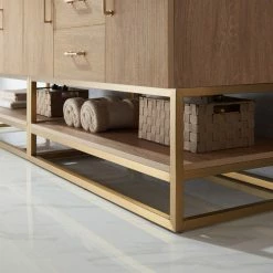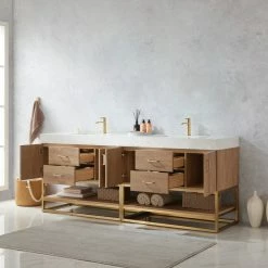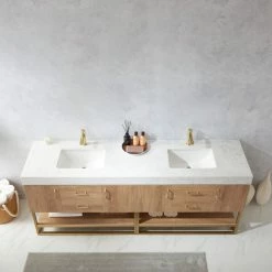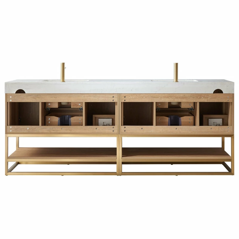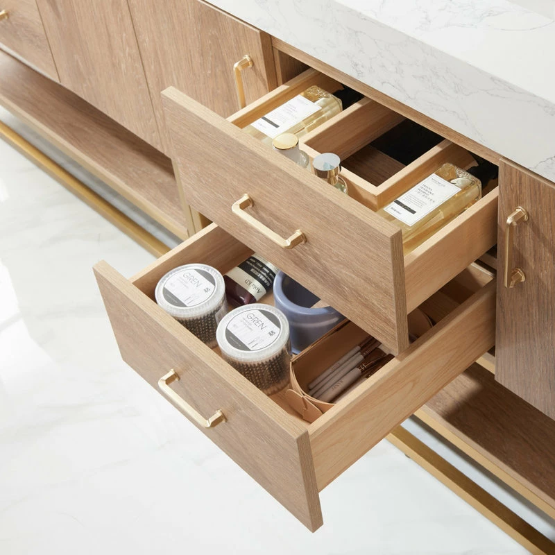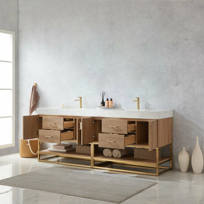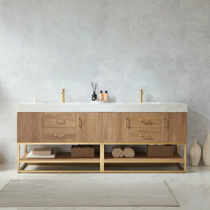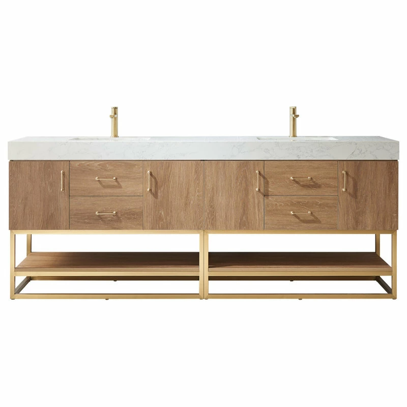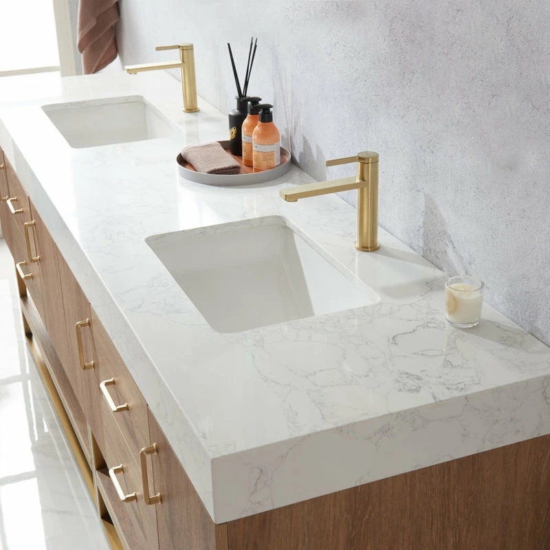 Alistair will add elegance and head-turning style to your modern bathroom space, accompanied with mirror duo. It combines the warmth of an earthy oak cabinet with a vibrant white stone for a contemporary finish. The vanity is adorned with brushed gold hardware for a true opulent finish.