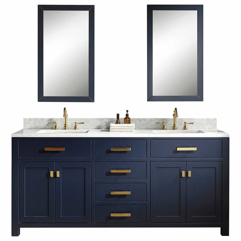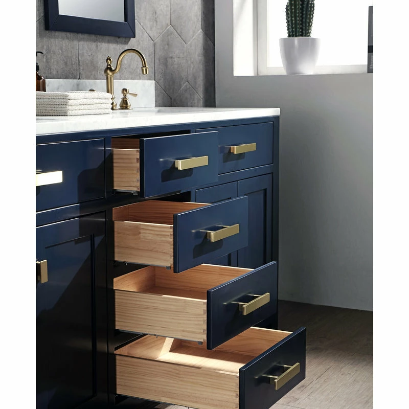 Water Creation’s collection of premier double sink bathroom Vanity will add a level of sophistication and class to any bathroom’s decor. The crossroads of timeless design and innovative modern manufacturing processes merge harmoniously to ensure each vanity’s finishes and function are as reliable as their unmistakable beauty. Constructed of 100% hardwood and not particle board, Water Creation prides itself on creating high-class Vanity that are designed to last a lifetime. The marble countertop, ceramic sinks, and elegantly crafted doors and drawers all lend credence to the durability and superior craftsmanship that Water Creation is known for. With the understanding that no one space is alike, all of Water Creation’s vanity designs come in multiple lengths to accommodate any room size.Material: All of Water Creation’s Vanity are made from select hardwoods that have been kiln dried to ensure a stable product that will not expand, contract, or warp.Construction: Using joinery techniques that are made to hold together for a lifetime, all Vanity come fully assembled and include interior shelving and a large cut out in the back for plumbing access.Countertop: All of Water Creation’s Vanity come with solid natural stone countertops that have been sealed at the factory to prevent staining and watermarks. Countertops are pre-drilled for a standard 8″ widespread 3 hole lavatory faucet. The backsplash is included. It is optional to attach the backsplash onto the vanity top.Sinks: Two undermount rectangular shaped ceramic sinks included.Finish: The multi-step finish process on the Vanity is not only rich with color and pleasing to the eye, it is also a very durable; acting as an outer shell to help protect your vanity from wear and damage that may occur in everyday use. Actual color may vary slightly due to different computer monitor display settings.